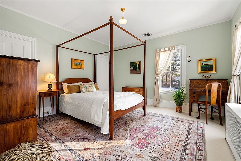 A serene master bedroom showcases a warm, inviting ambiance with its soft, pale green walls that complement the natural light filtering through the large window. The focal point is a beautifully crafted four-poster bed, draped with crisp white linens, offering both elegance and comfort. Flanking the bed, rustic wooden nightstands provide functionality with vintage charm. An intricately patterned area rug grounds the space, harmonizing with the rich wood tones of the furniture. A cozy writing desk, adorned with a classic chair, creates a perfect spot for inspiration, while framed art adds character and warmth, making this retreat perfect for relaxation.