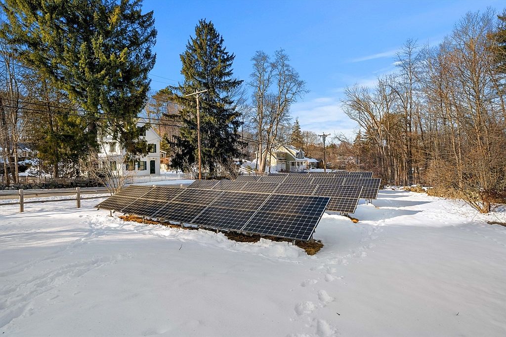 This outdoor space features a modern solar panel installation amidst a winter landscape, showcasing the sustainability aspects of the home. The arrangement of panels emphasizes eco-friendliness while standing out against a backdrop of fresh snow. In the distance, a charming American home is partially obscured by tall trees, adding a sense of privacy and tranquility. The house exhibits a classic design with a blend of warm colors, harmonizing with nature. The surrounding area is family-friendly, offering ample space for outdoor activities, while the integration of renewable energy makes it an appealing choice for environmentally conscious homeowners.