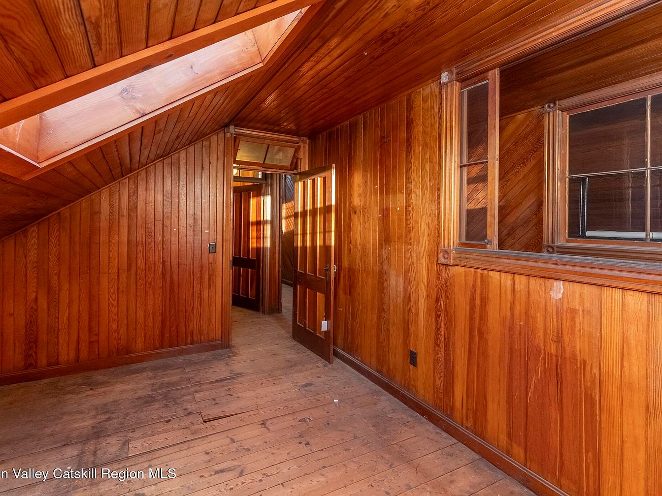 A cozy attic hallway features richly stained wooden paneling on the walls and ceiling, creating a warm, rustic ambiance perfect for a family home. The sloped ceiling is adorned with a substantial skylight that allows natural sunlight to flood the space, enhancing the inviting, organic feel. Sturdy wooden floors provide a durable surface for kids at play or creative storage solutions. An interior window with sliding panes connects to an adjoining room, encouraging light flow and connectivity. The compact but open layout is ideal for a reading nook, play area, or a transition space to bedrooms in a family-friendly environment.