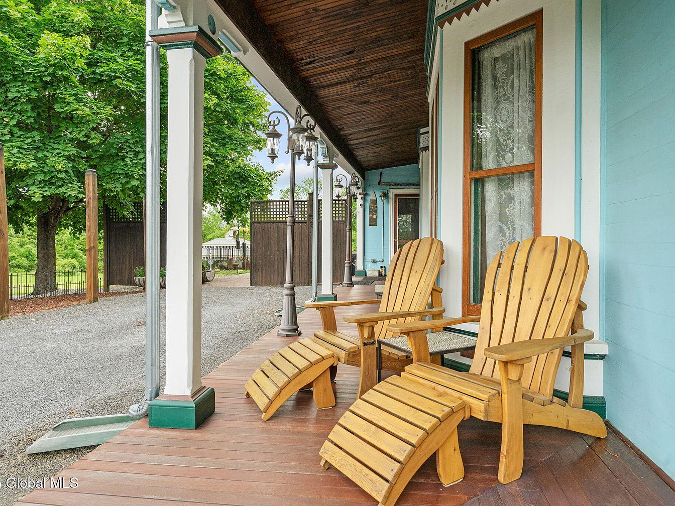 The inviting porch features two beautifully crafted wooden Adirondack chairs, perfect for leisurely afternoons. The rich brown flooring complements the vertical posts painted in refreshing aqua, enhancing the charming rustic appeal. Lush greenery from nearby trees frames the entrance, creating a tranquil backdrop for relaxation. Elegant outdoor lighting hangs from the ceiling, offering warmth during the evening. Architectural details, such as intricate moldings and delicate lace curtains visible from within, add character and a touch of sophistication. This space encourages family gatherings, providing a serene environment that blends comfort with nature’s beauty, ideal for creating lasting memories.