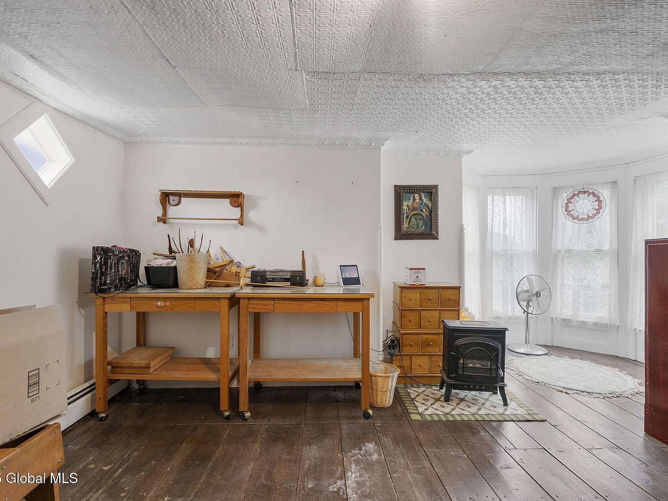 This inviting creative studio features a cozy layout with warm wooden accents and charming architectural details. The room benefits from natural light streaming through large bay windows, enhancing its bright and airy atmosphere. Wooden tables provide ample workspace, complemented by stylish storage solutions and personal touches like artwork on the walls. The rustic flooring contrasts beautifully with the clean, white walls and intricate ceiling, evoking a sense of homey elegance. Essentials such as a small heater and a fan ensure comfort, making it perfect for artistic endeavors or family projects, fostering creativity and warmth in every corner.