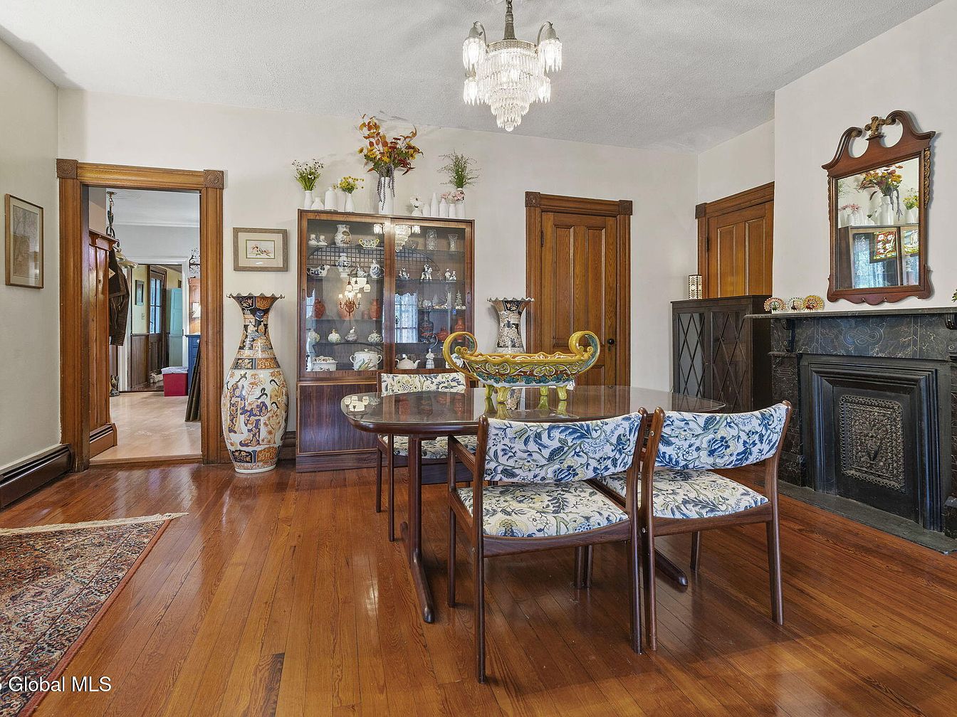 This inviting dining room blends classic charm with modern comfort. A polished wooden table sits at the center, surrounded by stylish chairs adorned with floral fabric, reflecting a harmonious color scheme of rich browns and soft blues. Elegant glass cabinets display vintage china and collectibles, emphasizing a refined aesthetic. Natural light pours in through the adjacent doorway, highlighting the intricate woodwork and gleaming hardwood floors. A striking porcelain vase stands proudly, adding a touch of artistic flair, while the vintage chandelier offers a warm, ambient glow, making it a welcoming space for family gatherings and special occasions.
