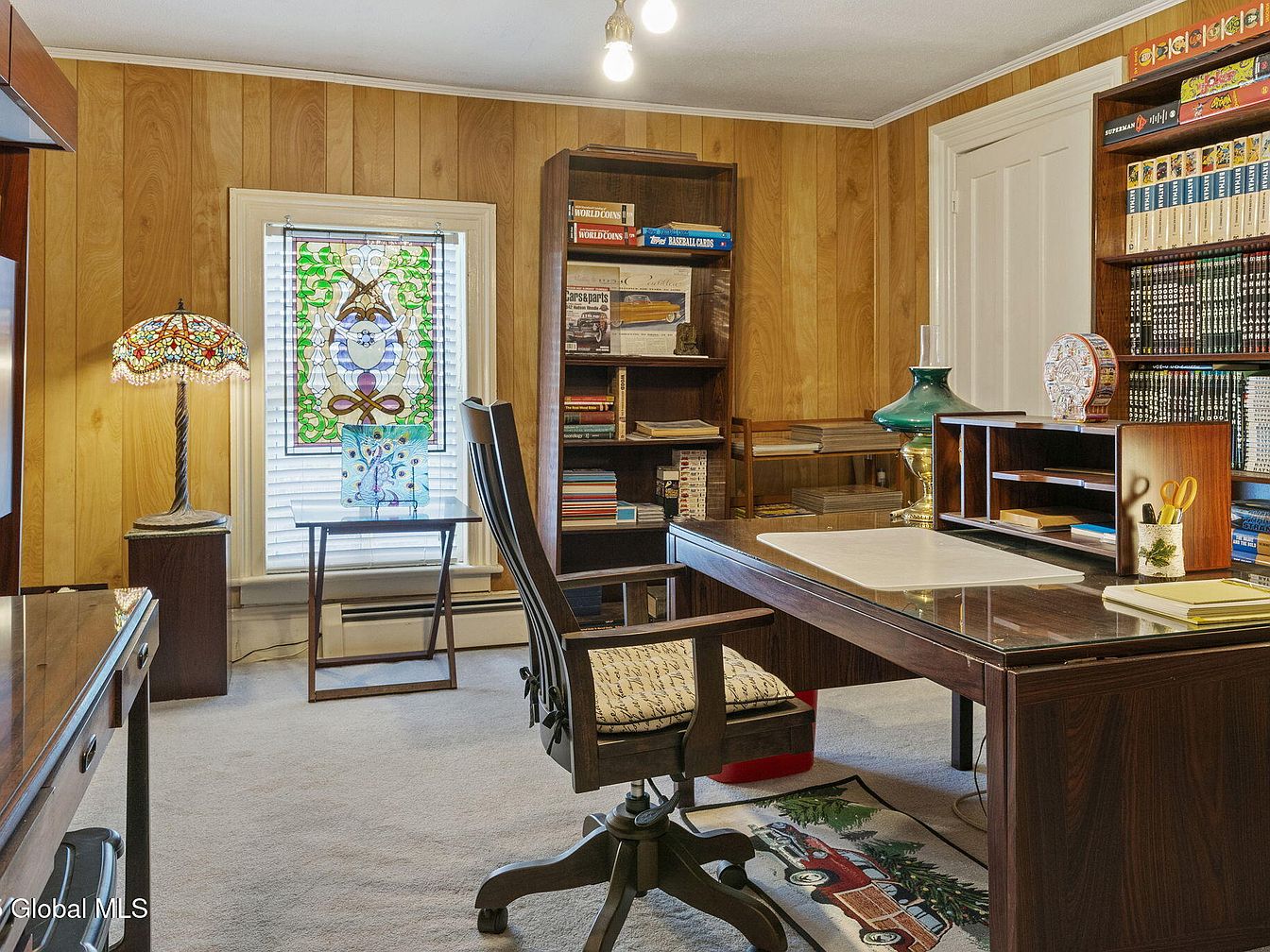 This home office features warm wood paneling lending a cozy, inviting feel. A spacious desk with a glossy surface is complemented by a comfortable, swivel chair, ideal for productivity. The room is bathed in natural light from a charming stained glass window, showcasing intricate floral designs. Alongside, a decorative table lamp enhances the ambiance with its soft illumination. Built-in bookshelves occupy the walls, neatly arranging books and collectibles, while a carpet leads into the room, adding a touch of warmth. The overall color palette of deep browns and vibrant accents creates an inspiring workspace for creativity and focus.