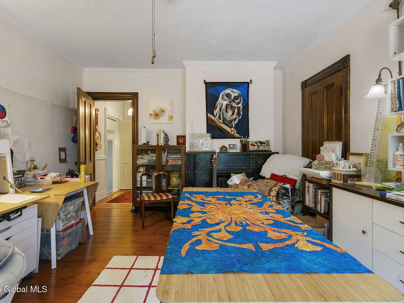 This vibrant creative studio showcases a blend of functionality and personal expression. The room features a spacious layout, highlighted by a large, colorful quilt atop a central table, perfect for crafting or artistic endeavors. Warm wooden floors harmonize with the light pink walls, while rich wooden trim adds character and warmth. A cozy reading nook invites relaxation, furnished with a comfortable chair and decorative throw. Natural light floods in through the doorway, enhancing the cheerful ambiance. Shelves filled with art supplies and books reflect a nurturing, family-friendly environment, ideal for creativity to flourish.