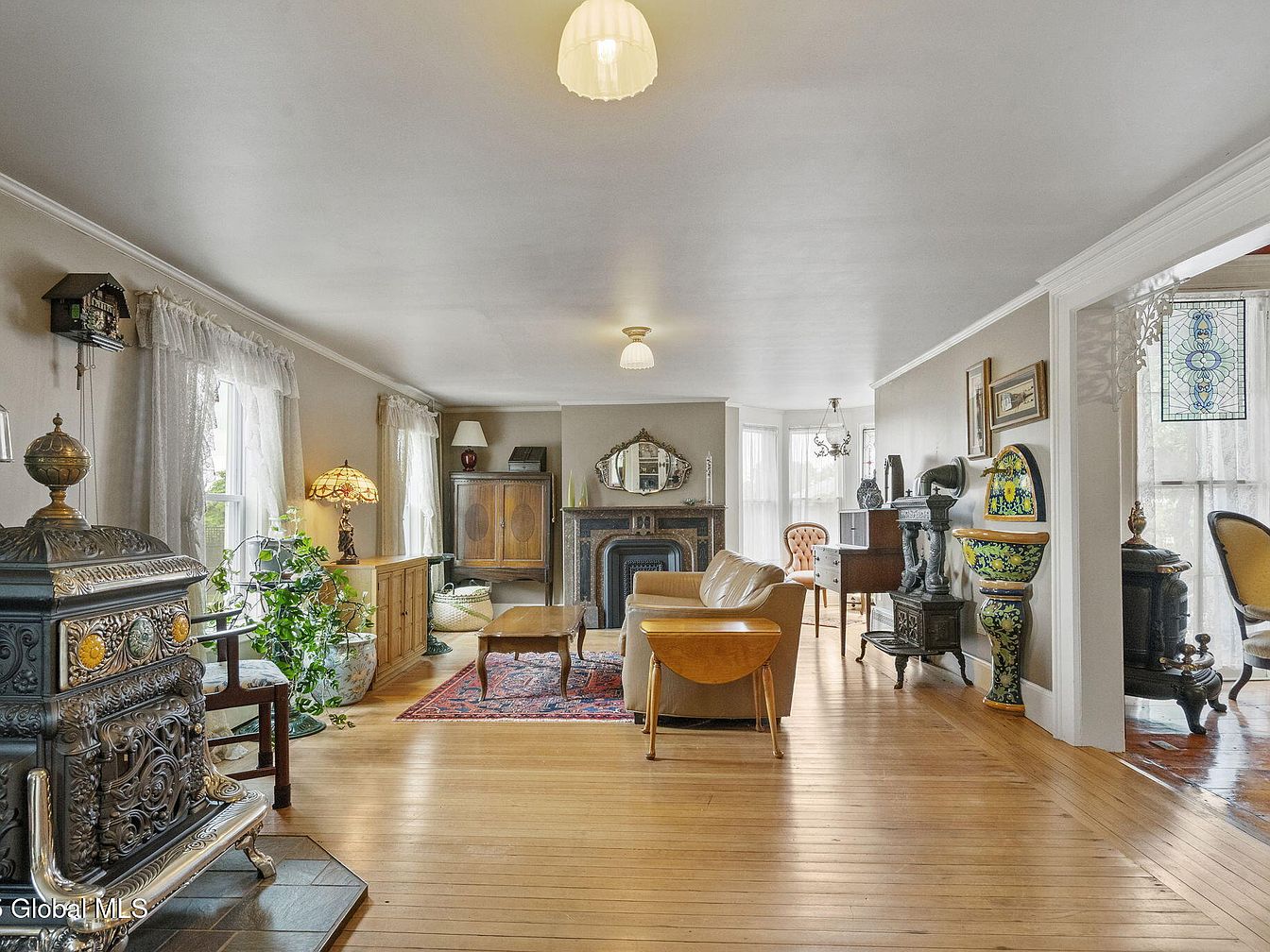 This inviting living room blends classic charm with modern comfort. Rich wooden floors enhance the spacious layout, where large windows draped in soft, sheer curtains allow natural light to fill the space. The warm, neutral color palette complements the intricate details of the vintage decor, including an ornate freestanding stove and stylish furniture. Cozy seating is positioned around a beautiful area rug, encouraging gatherings and family moments. Various decorative pieces, from a vintage lamp to a stunning stained glass window, add character and charm, inviting relaxation and warmth in this well-appointed family-friendly environment.