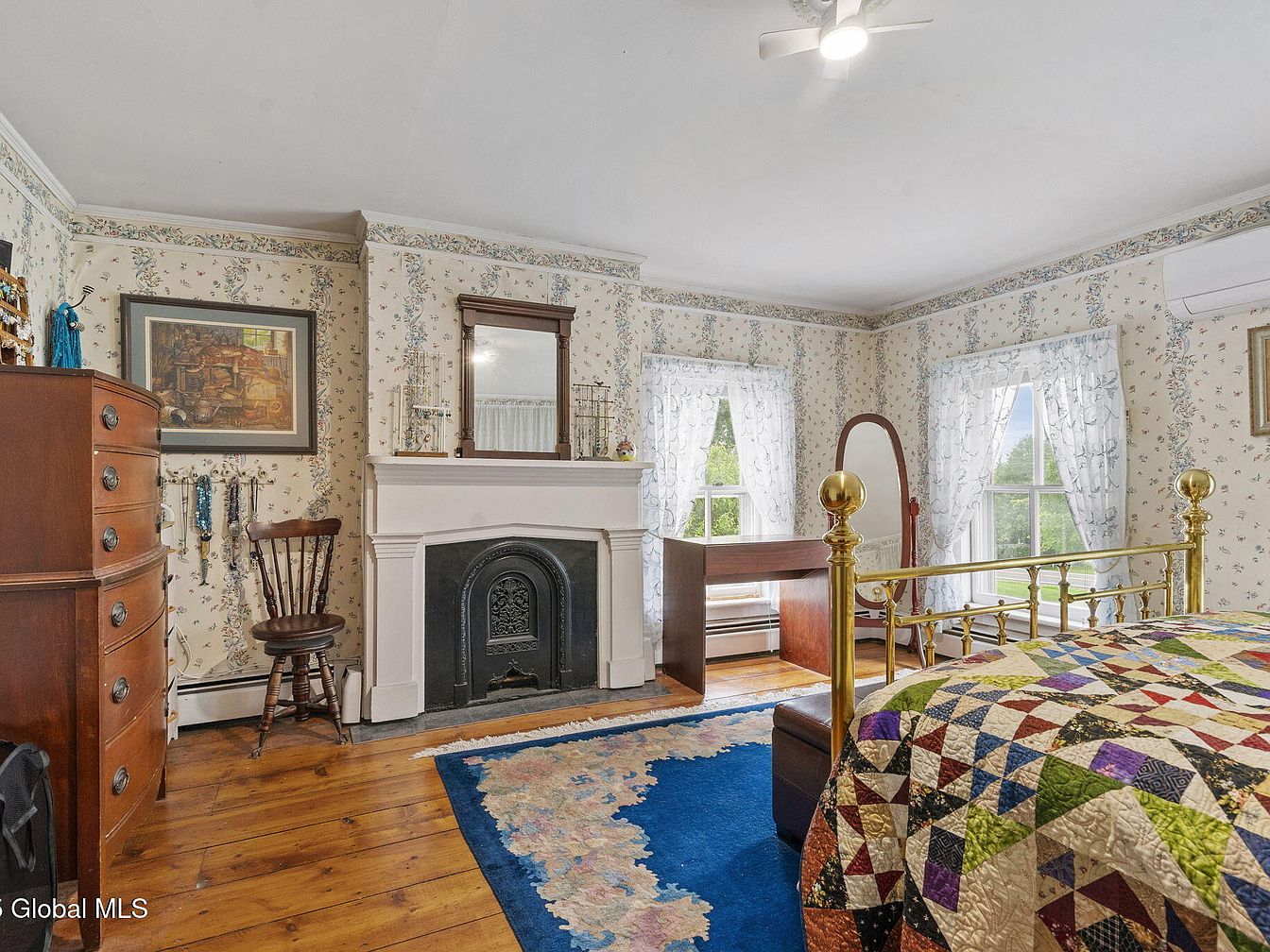 This serene bedroom features a charming vintage aesthetic, highlighted by delicate floral wallpaper that creates a warm and inviting atmosphere. A brass bed frame, adorned with a colorful patchwork quilt, stands as the room’s focal point. To one side, a wooden dresser and a classic chair add functional elegance, while the decorative fireplace adds character and a touch of nostalgia. Natural light floods through large windows, draped with lace curtains, offering picturesque views of the outdoors. The warm wooden floor complements the colorful area rug, enhancing comfort and making this a perfect family-friendly space.