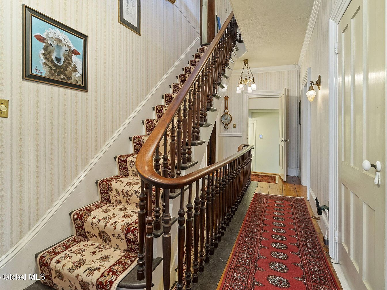 This elegant staircase hallway exudes classic charm, featuring rich wooden banisters and a plush, patterned carpet that adds warmth. The walls are adorned with subtle floral wallpaper, enhancing the inviting atmosphere. Soft, vintage lighting fixtures illuminate the space, creating a cozy ambiance perfect for family gatherings. Art pieces, including a delightful painting of a sheep, add a touch of personality to the decor. A long, decorative runner guides visitors up the stairs, while doors leading to other rooms promise family-friendly accessibility. This beautiful entryway invites exploration and reflects a timeless elegance that welcomes all.