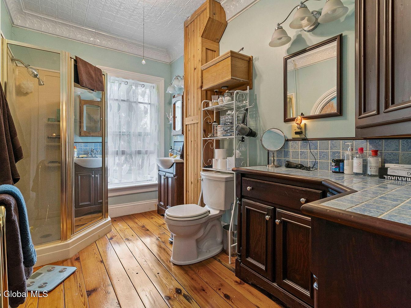 This charming bathroom combines modern functionality with vintage aesthetics. Beautiful wooden flooring adds warmth and character, complemented by soft blue walls that evoke a serene atmosphere. The layout features a glass shower enclosure and dual sinks, offering both convenience and style. Elegant light fixtures enhance the space, casting a soft glow over the mirrored cabinetry. Ample storage is provided by both wooden and metal shelving, along with stylish accents like decorative tiles. The large window allows natural light to fill the room, making it a comforting retreat for the family. Every detail invites relaxation and functionality.