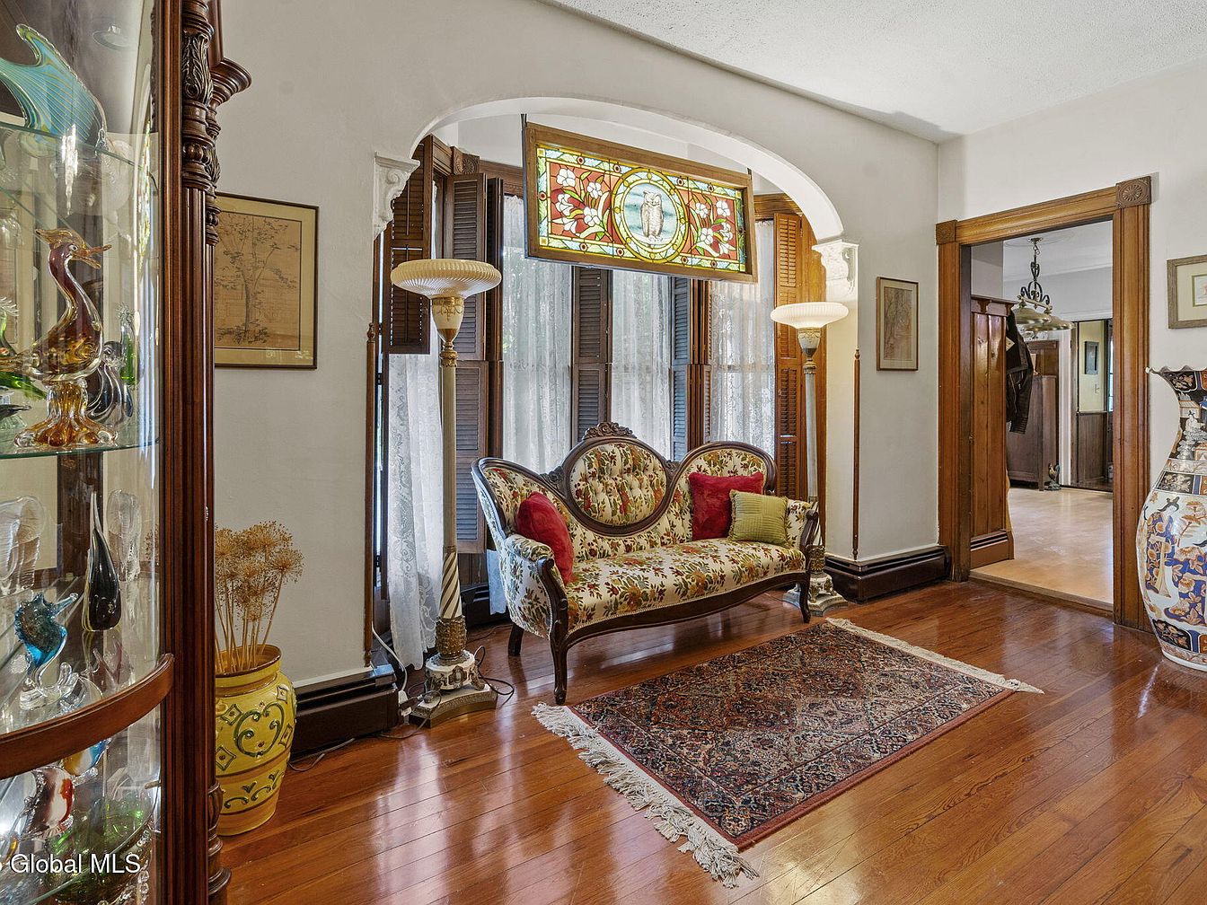 This charming entryway showcases a blend of classic aesthetics and modern comfort. Rich wooden paneling and polished hardwood floors create a warm and inviting atmosphere, while the elegantly upholstered settee adds a touch of vintage luxury. A stunning stained glass window allows natural light to filter in, casting colorful patterns that enhance the room’s ambiance. Accent pieces, such as decorative vases and an ornate lamp, provide a cozy, welcoming feel, perfect for family gatherings. The open layout leads seamlessly into other living areas, ensuring this entryway serves as a functional yet stylish focal point in the home.