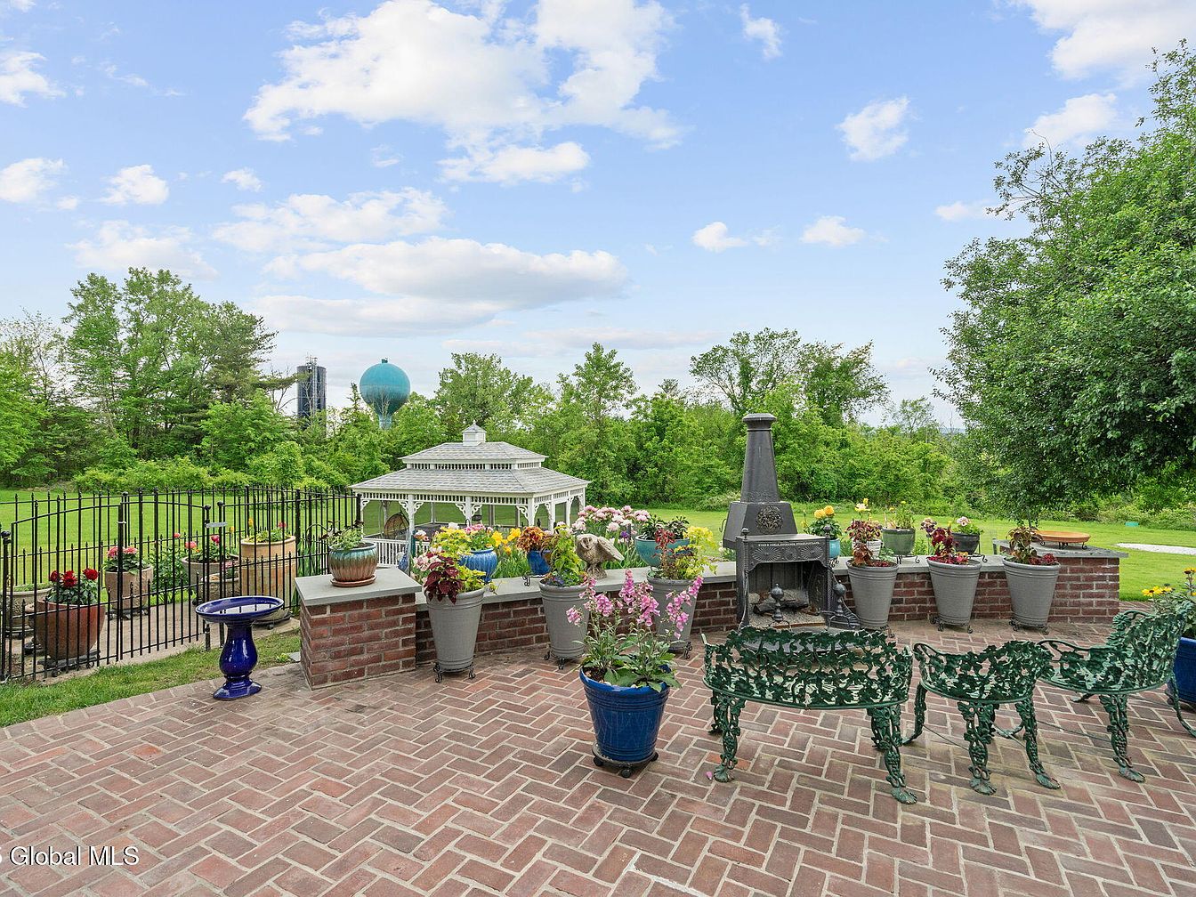 This charming outdoor patio features a brick-paved flooring that provides a rustic yet inviting atmosphere. Vibrant flower pots in various sizes dot the perimeter, showcasing a delightful array of colors and adding a touch of nature’s beauty. A gazebo in the background offers a shaded retreat, perfect for gatherings. The elegant metal seating invites family and friends to relax and enjoy the serene views of the surrounding greenery. An outdoor fireplace functions as a cozy focal point, encouraging evenings spent under the stars. The overall design blends functionality with aesthetic appeal, creating a perfect setting for entertainment.