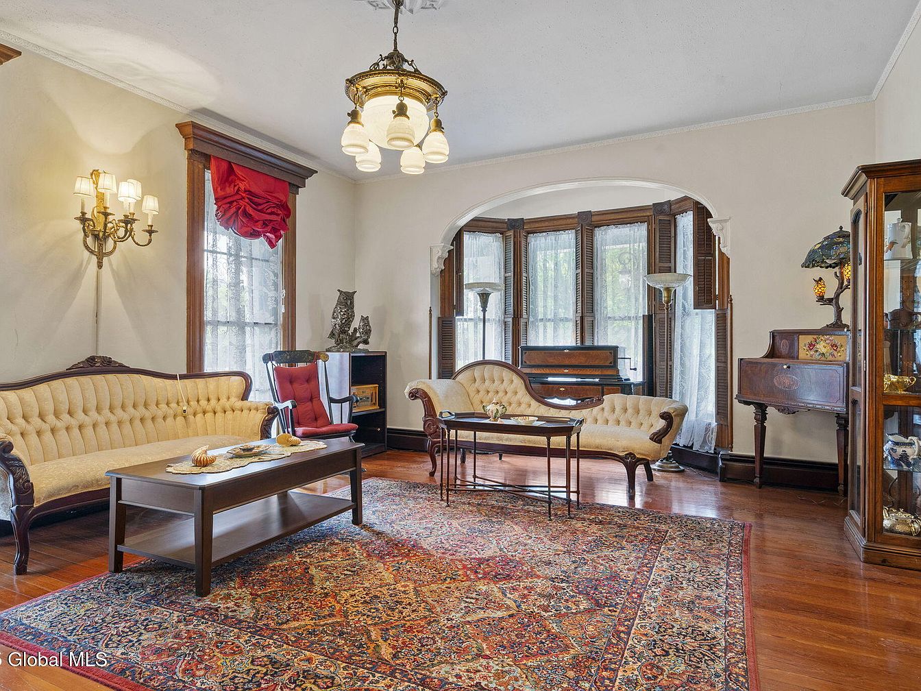 This inviting living room combines elegance with comfort, showcasing a harmonious blend of vintage and modern design. Rich hardwood floors set the stage for exquisite furnishings, including a pair of tufted, cream-colored settees that flanking an ornate coffee table. Large bay windows bathe the space in natural light, adorned with sheer drapes and deep red valances that add warmth. Architectural details, such as crown molding and wall sconces, enhance the sophisticated ambiance. A classic piano and a detailed display cabinet contribute to the home’s charm, making it perfect for family gatherings or intimate conversations.