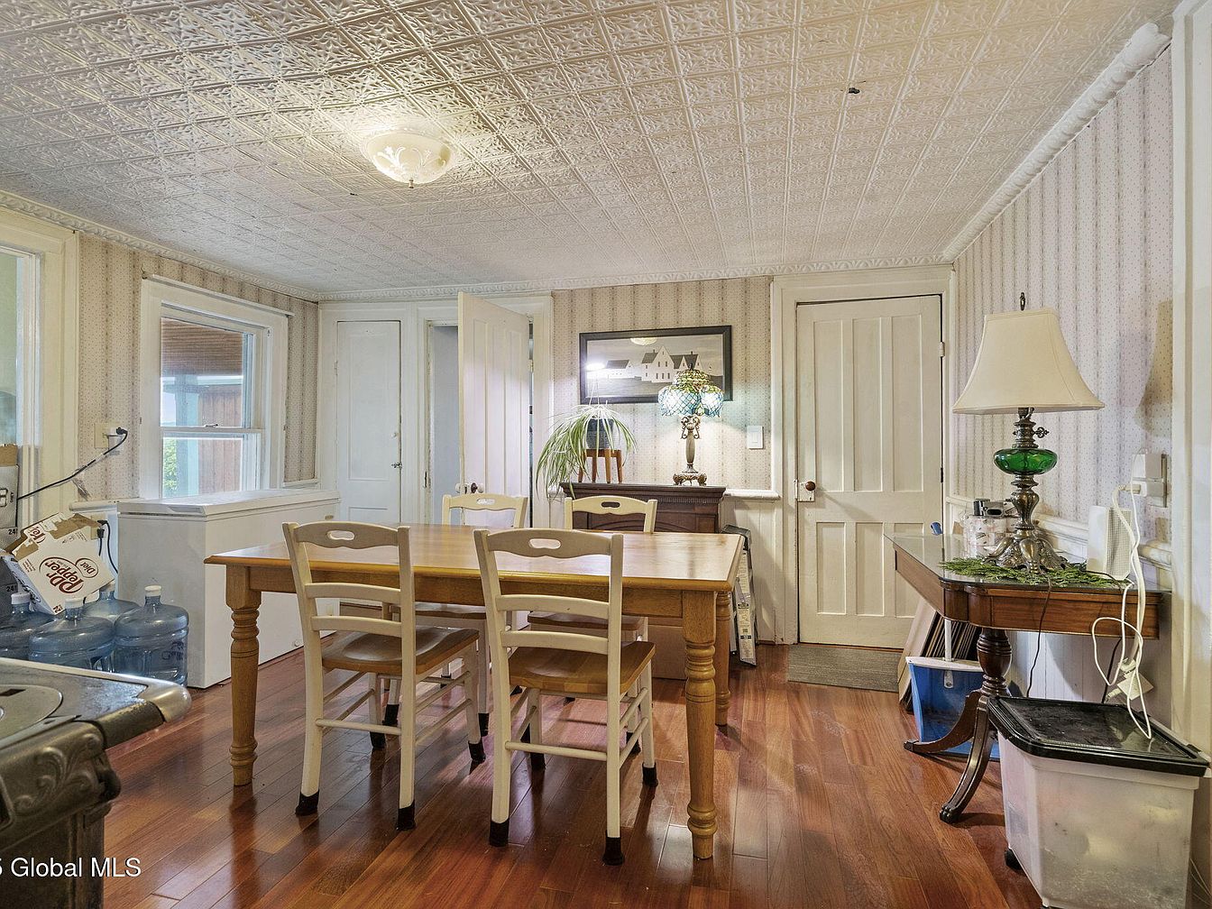 This inviting dining room highlights a warm, family-friendly atmosphere, featuring a sturdy wooden table surrounded by light-colored chairs. The elegant tin ceiling adds a touch of vintage charm, complementing the soft, pastel wallpaper that enhances the room’s brightness. Natural light floods in through large windows, illuminating the polished hardwood floors. A classic lamp with a green base provides additional lighting, while tasteful décor adorns the walls, infusing character. A sideboard offers storage and display space, emphasizing functionality. Thoughtfully designed, this area encourages gathering and conversation, perfect for shared meals and memorable moments.
