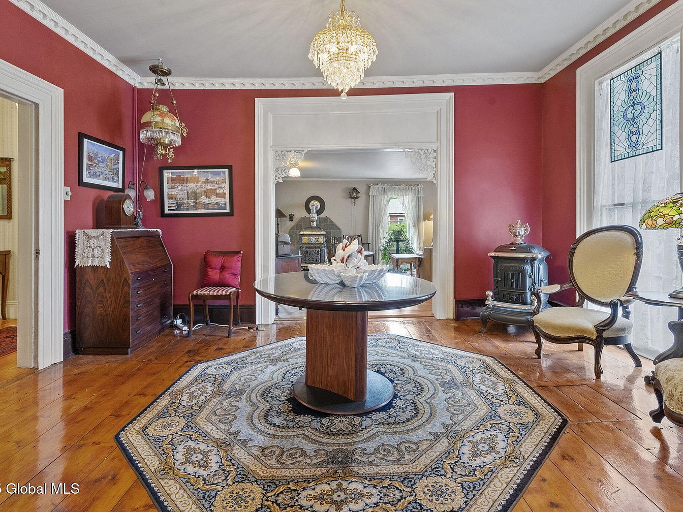 Rich crimson walls create a warm, inviting atmosphere in this formal dining space, accentuated by elegant white trim and intricate crown molding. A round wooden table, paired with upholstered chairs featuring subtle stripes, serves as the centerpiece, ideal for family gatherings. A vintage lamp casts a soft glow, complementing the beautiful hardwood flooring and classic area rug. The room features large windows adorned with sheer drapes, allowing natural light to flood in while showcasing lovely stained glass details. A cozy armchair invites relaxation as decorative accents add charm, making it a perfect blend of style and comfort.