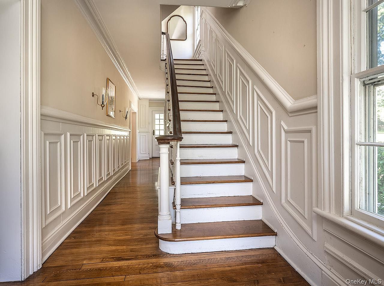 A striking traditional staircase with classic white wainscoting sets a warm and welcoming tone just inside the home’s entryway. The natural wood steps and polished hardwood floors provide a rich contrast to the creamy neutral walls, creating an inviting, family-friendly space. Large windows flood the area with natural light, enhancing the airy and open feel. Elegant crown molding and detailed paneling add timeless architectural charm, while subtle wall sconces offer a gentle ambiance for evening hours. The spacious hallway is ideal for bustling family mornings, while the sturdy handrail and wide steps ensure safety and comfort for all ages.