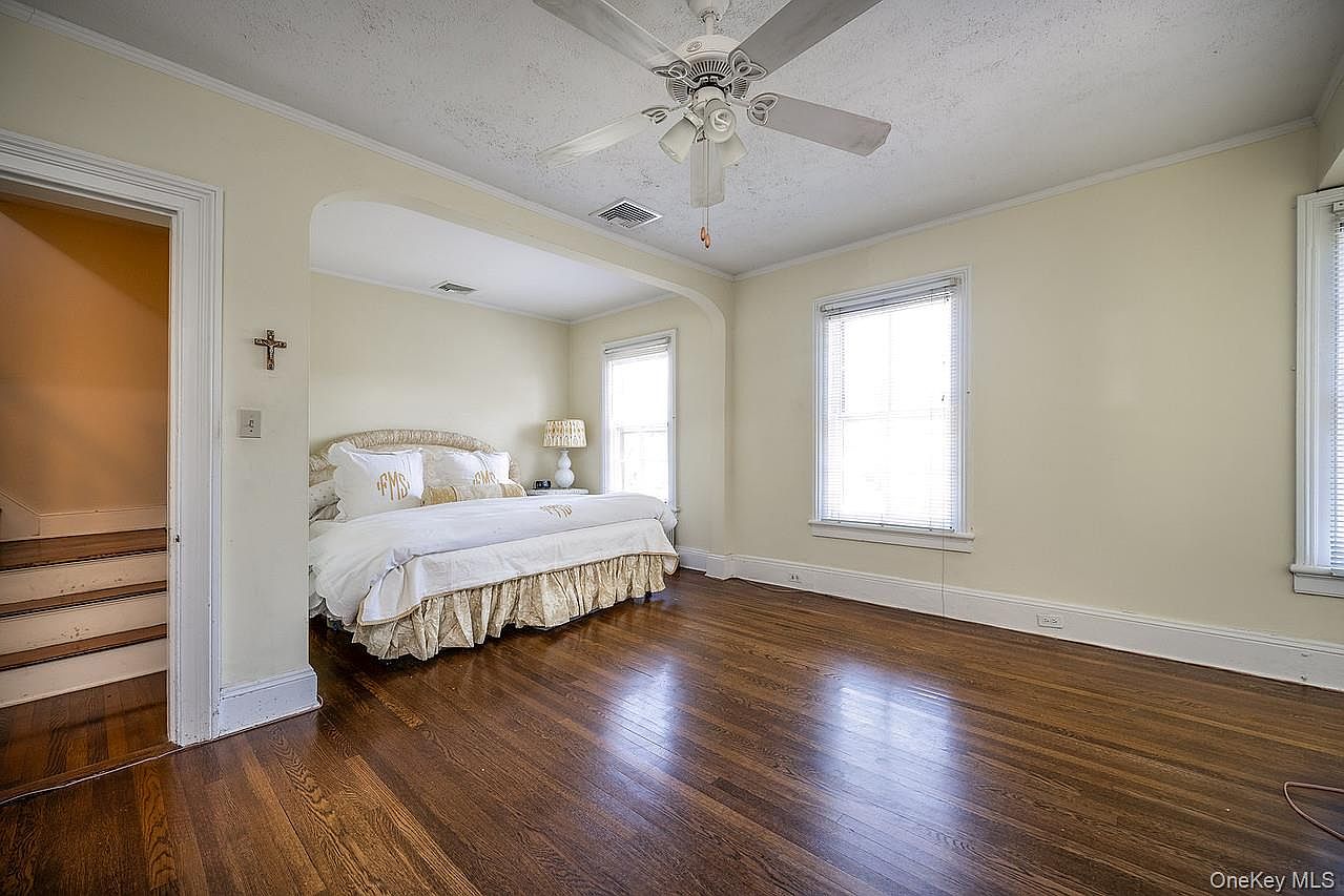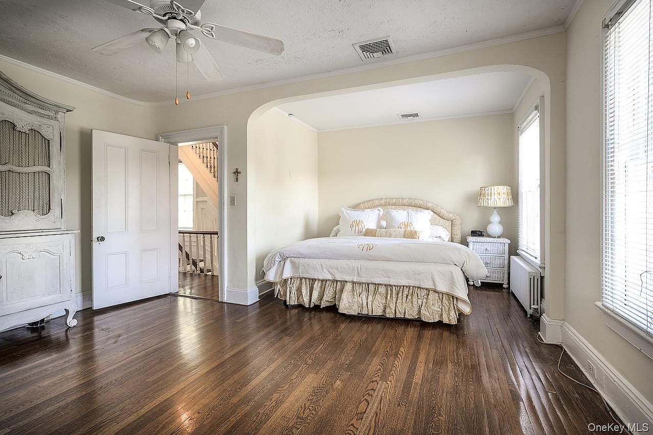 A spacious and inviting master bedroom suite features elegant hardwood floors that bring warmth to the room. Natural light streams in from two large windows, accentuating the soft, creamy hues on the walls and bedding. The bed is framed by a charming alcove, providing a cozy, semi-private nook perfect for relaxation. Family-friendly touches include generous floor space for movement and play, as well as a ceiling fan for added comfort. A vintage armoire and a matching nightstand add character, while classic white trim and an arched doorway showcase timeless architectural details ideal for a welcoming family home.