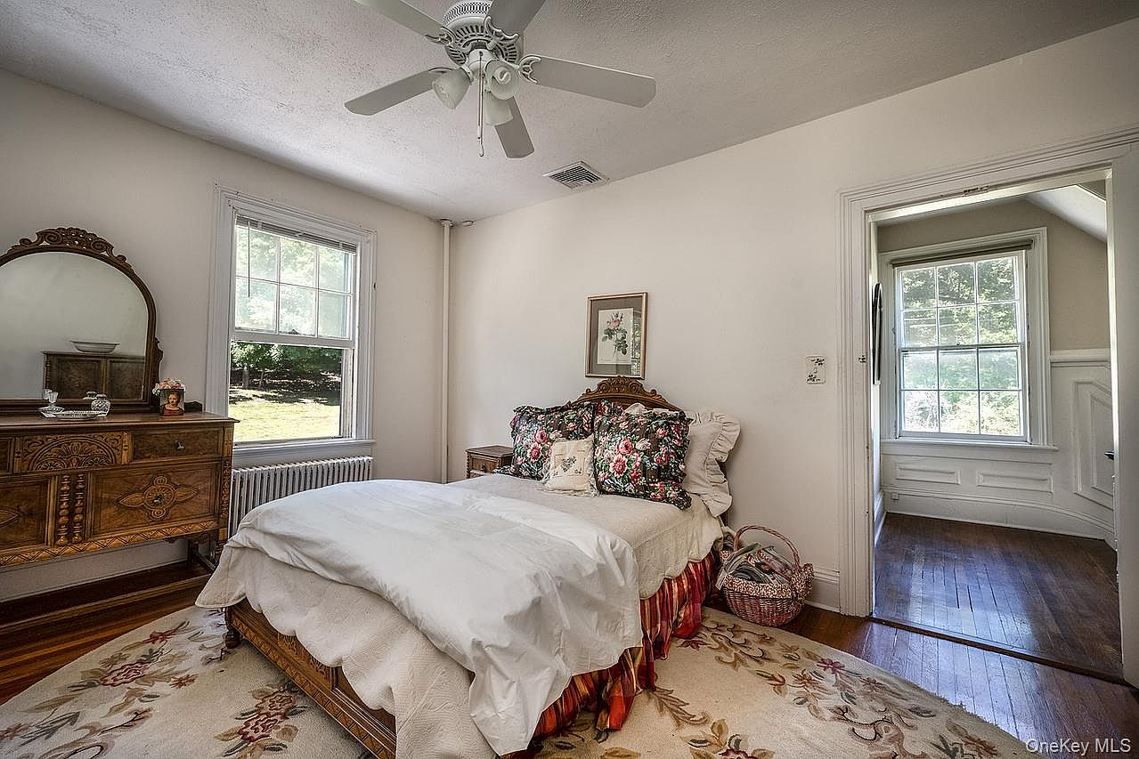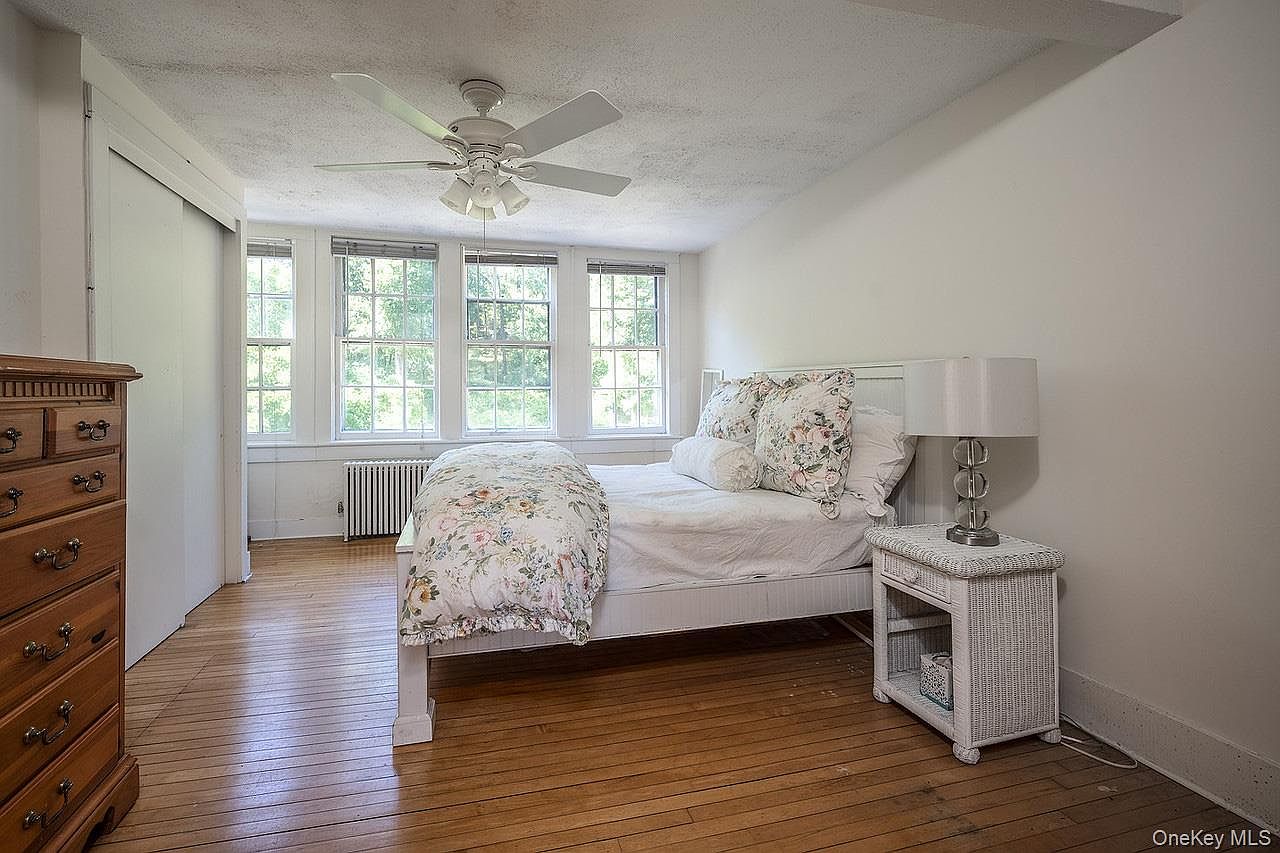 Bright and airy, this bedroom features expansive windows across one wall, flooding the space with natural light and offering tranquil views of the outdoors. The centerpiece is a cozy white bed dressed in floral linens, contributing to a welcoming, family-friendly environment. The decor combines soft, neutral walls with warm-toned wood floors, complemented by a wicker nightstand and a classic lamp. A ceiling fan provides comfort, while a vintage-style wooden dresser adds character and storage. The closet with sliding doors keeps the room uncluttered, making this a peaceful and functional sanctuary ideal for all ages.