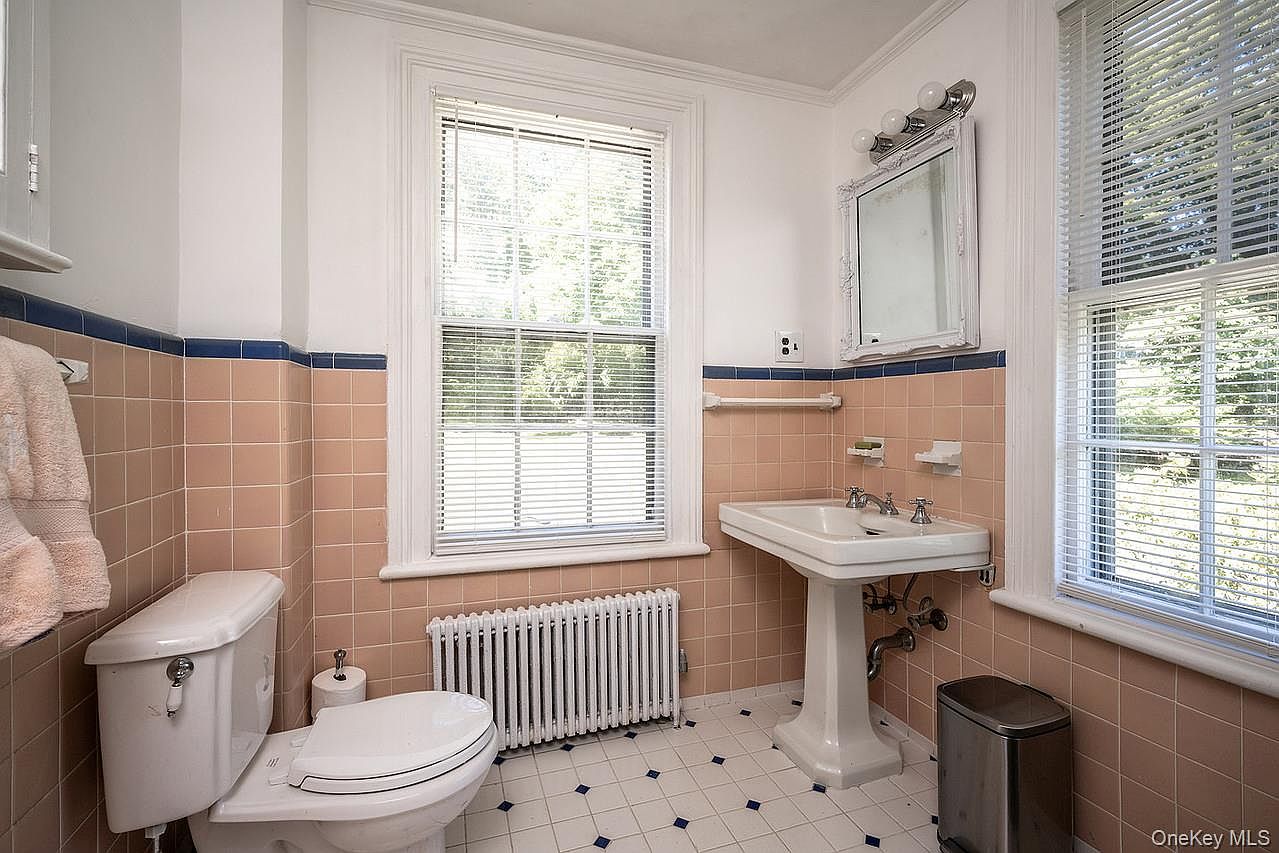 This bathroom exudes a classic charm with its peach-hued wall tiles accented by a slim band of navy blue, creating a nostalgic yet welcoming atmosphere. Large double windows with white trim invite plenty of natural light, highlighting the vintage pedestal sink and classic porcelain toilet. The checkerboard floor, finished in white with blue accent tiles, adds a playful yet clean feel. Practical family-friendly features include a towel rack, sturdy radiator, and a wall-mounted safety bar near the sink, making it accessible for all ages. The overall spaciousness, bright ambiance, and easy-to-clean surfaces cater to comfortable daily living.