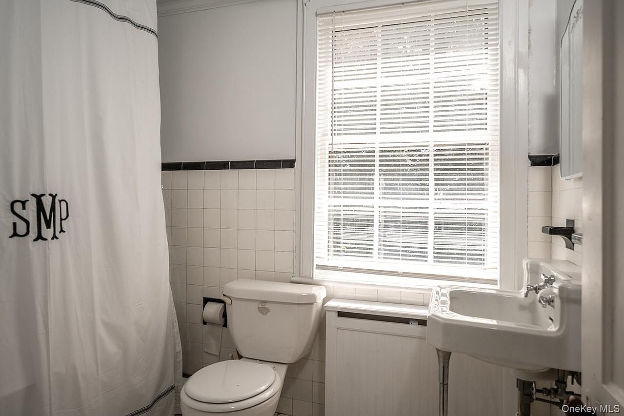 This bright and inviting bathroom features a timeless black-and-white color scheme, pairing crisp white tile with a striking black trim that exudes elegance. The space is well lit by a generous window fitted with white blinds, allowing in natural light while maintaining privacy. The room includes a traditional pedestal sink and a compact toilet, maximizing the available floor area for easy movement, making it family-friendly. Classic fixtures and a monogrammed shower curtain add a personal touch, while the clean lines and minimal decor maintain a fresh, organized ambiance perfect for families of all ages.