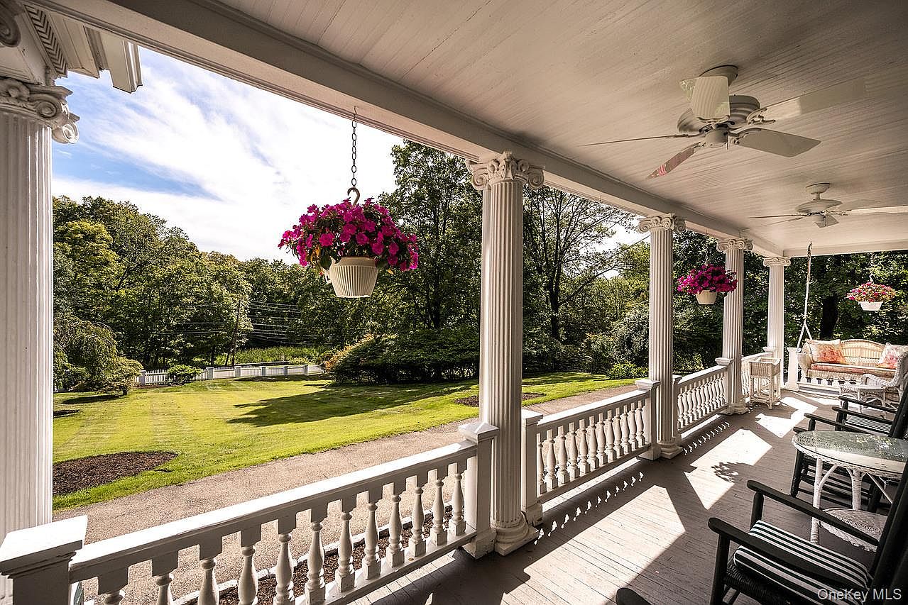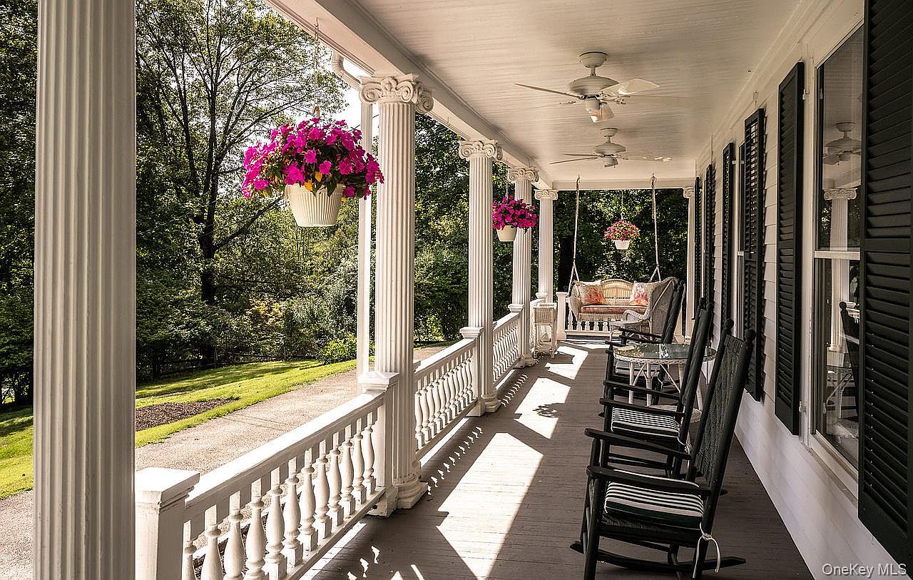 A spacious and inviting front porch with classic white columns and decorative railing overlooks a lush, green lawn bordered by mature trees. Hanging flower baskets add vibrant pops of color, while the white wicker porch swing and matching chairs create a cozy, family-friendly space to enjoy morning coffee or conversation. Ceiling fans provide comfort on warm days, enhancing the porch’s usability year-round. The neutral color palette of the woodwork and furniture emphasizes the serene, timeless elegance of the home, perfect for relaxing or hosting gatherings in a picturesque setting. This porch effortlessly blends charm and everyday comfort.
