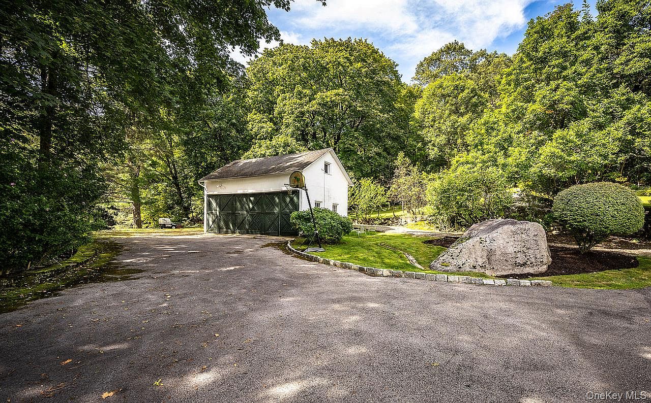 A spacious, paved driveway leads to a charming detached garage with double green doors, surrounded by lush, mature trees and manicured landscaping. The setting feels secluded and tranquil, ideal for families seeking both privacy and outdoor space for play or entertaining. The white garage features a simple, cottage-like architectural style, complementing the vibrant green of the surrounding foliage. Large boulders and neatly pruned shrubs enhance the natural beauty, while open areas provide plenty of room for activities such as basketball or biking. The seamless blend of nature and functional design creates an inviting and practical exterior entryway.