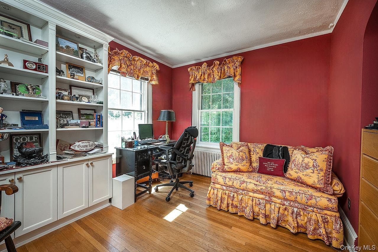 A cozy and inviting home office with rich red walls and white-trimmed windows offering excellent natural light. An elegant built-in shelving unit displays family mementos, books, and trophies, creating a personalized and lived-in ambiance. The space features a comfortable yellow patterned sleeper sofa, perfect for reading or accommodating overnight guests, making it family-friendly and versatile. A black ergonomic desk chair and classic wood desk enhance productivity and comfort, while golden floral window valances add warmth and character. The hardwood floor brings a timeless foundation, and the overall layout promotes functionality, warmth, and inspiration for work or relaxation.
