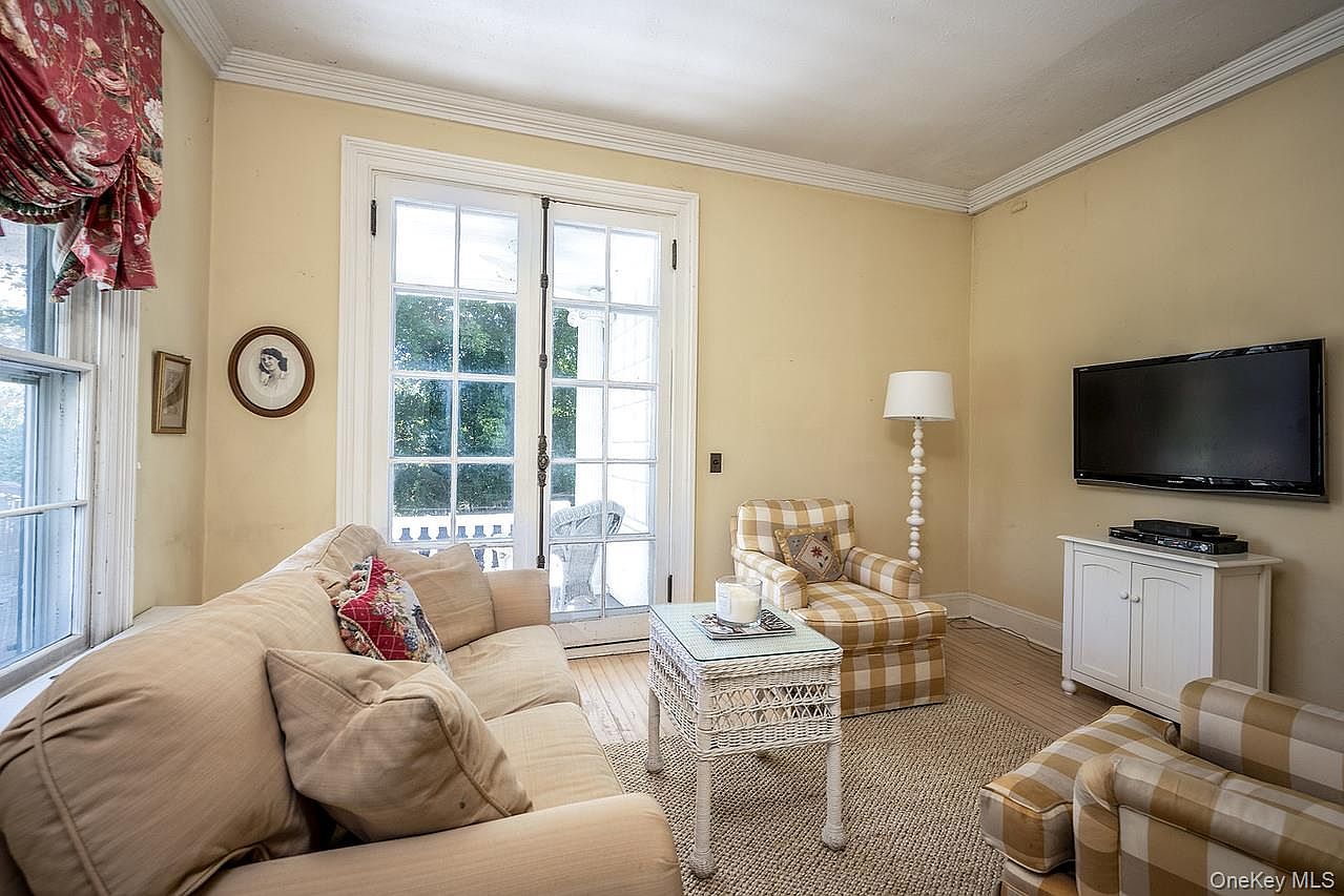 This charming living room exudes a welcoming ambiance, perfect for family gatherings or relaxing evenings at home. Warm yellow walls and natural light from the expansive French doors create a bright, cheerful space. The room features an inviting beige couch with floral accent pillows, paired with two plaid armchairs that highlight a playful yet classic style. A white wicker coffee table rests atop a textured area rug, adding a touch of cottage charm. The mounted television and sleek white entertainment cabinet keep family entertainment accessible, while crown molding and decorative curtains enhance the room’s timeless, family-friendly appeal.