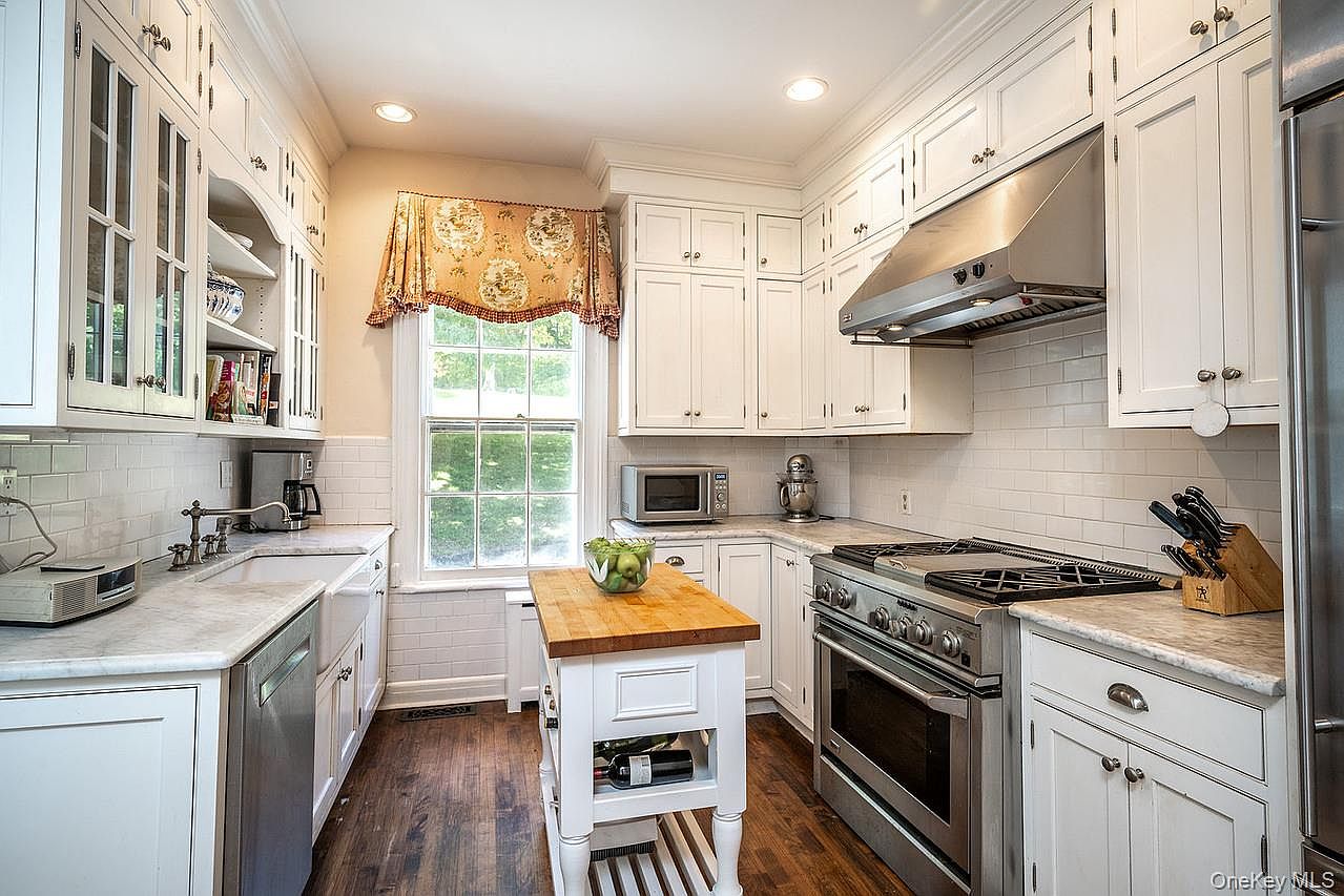 This inviting kitchen features crisp white cabinetry with classic paneling, complemented by glossy subway tile backsplash and elegant marble countertops. A central wooden-topped island provides extra prep space and family-friendly storage below, ideal for organizing produce or wine. Stainless steel appliances and a professional-grade range offer modern functionality, blending with traditional glass-front upper cabinets for a timeless feel. Warm wood floors add coziness underfoot, while a large window floods the room with natural light, enhanced by a decorative valance for homely charm. Ample storage, spacious counters, and an open, accessible layout cater to busy family life and entertaining.