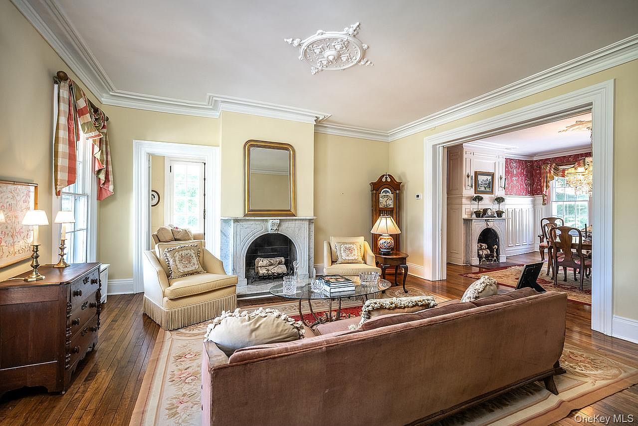 A bright, inviting living room featuring a traditional marble fireplace as the centerpiece, surrounded by cream-colored walls and detailed crown molding. Elegant furniture, including plush armchairs, a rose-hued sofa with decorative pillows, and a glass coffee table, create a cozy space for family gatherings. Hardwood floors add warmth, complemented by a soft floral area rug and vintage-style chest. Large windows draped in classic plaid curtains flood the room with natural light. A stately grandfather clock and delicate lamp provide refined accents. The open layout seamlessly leads into a formal dining room, making this space ideal for entertaining and family interaction.
