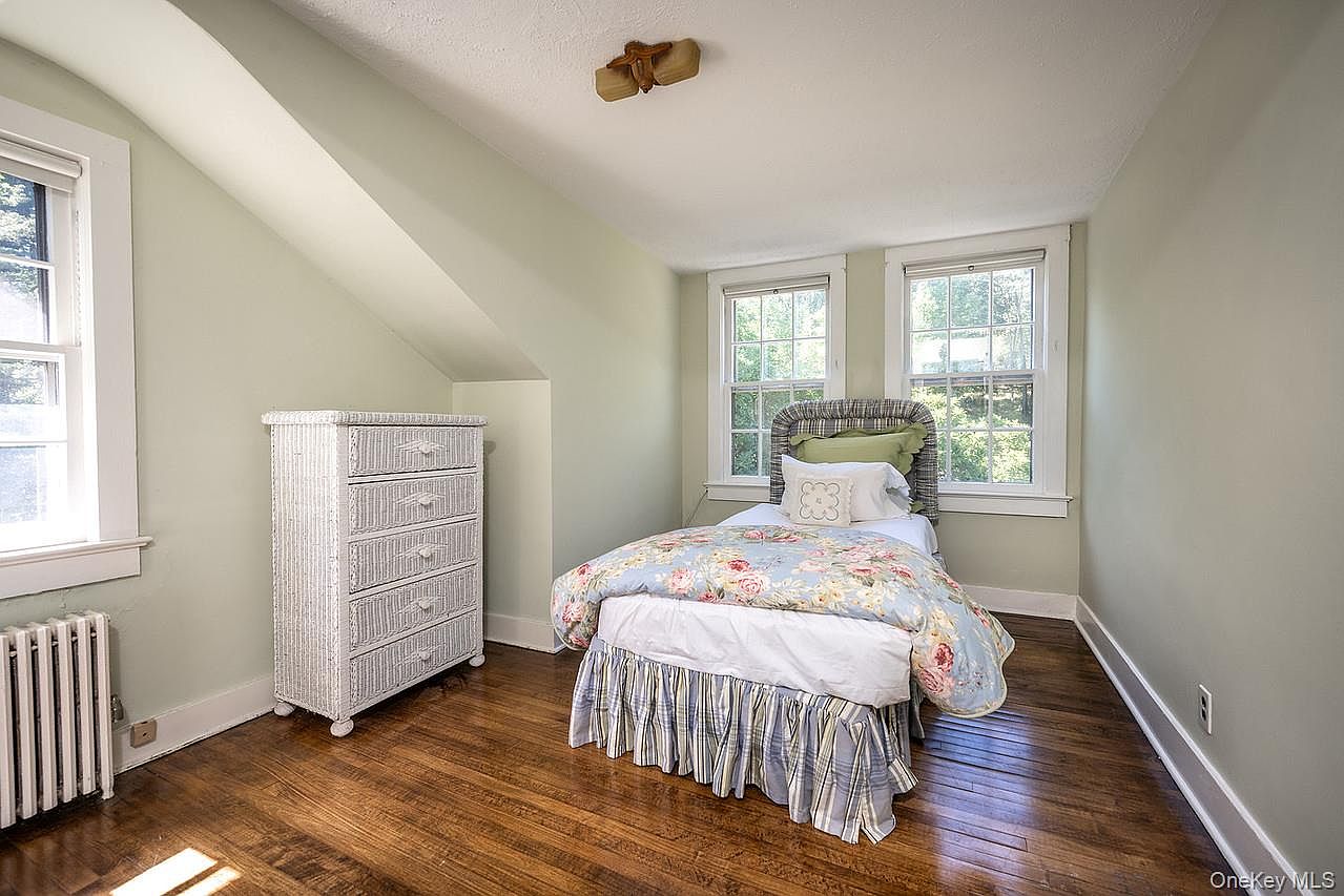This charming small bedroom features soft sage-green walls that create a calming, inviting retreat perfect for children or guests. The sloped ceiling and angled wall add architectural interest, while two large windows bathe the room in natural light, making the space feel airy and cheerful. The cozy single bed is dressed in floral bedding with cheerful pastel tones and an accent pillow, promising comfort and warmth. A white wicker chest of drawers provides ample storage and adds a touch of cottage style. The polished hardwood floor is low-maintenance and family friendly, making this room practical and welcoming for all ages.
