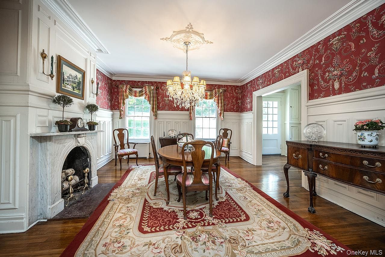 An elegant dining room features intricate wainscoting and rich, deep red wallpaper with classic floral patterns for a stately, inviting atmosphere. A large area rug in cream and burgundy defines the dining area, complementing the polished hardwood floors and adding warmth and comfort. Centered under a sparkling crystal chandelier, the round wooden dining table is surrounded by traditional Queen Anne chairs, making family gatherings both cozy and formal. Natural light pours through generously sized windows adorned with patterned valances, creating an airy feel. A marble fireplace, vintage sideboard, and graceful crown moldings complete the timeless, family-friendly aesthetic.