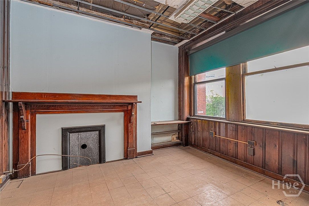 This charming living room features a warm wooden mantelpiece, showcasing intricate carvings that reflect classic craftsmanship. The ample natural light pours through the large windows, framed by soft, muted blinds, creating a bright and inviting ambiance. The wood paneling adds a touch of rustic elegance, complementing the light-colored walls and tile flooring. A built-in shelf offers a convenient space for decorative items or family photos, enhancing the room’s homey feel. With its spacious layout, this area is perfect for gatherings, encouraging family interaction in a cozy and welcoming environment.