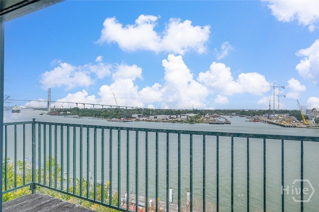 This spacious balcony offers a breathtaking view of the waterway and surrounding landscape, merging modern living with nature. The railing design enhances safety while maintaining unobstructed sightlines, perfect for relaxing or entertaining. Soft, muted tones in the backdrop complement the blue skies and fluffy clouds, creating a serene atmosphere. Family-friendly features include ample space for gathering, with potential for outdoor furniture arrangements tailored for social events. The nearby bridge and construction in the landscape provide a contemporary urban charm, showcasing an engaging environment while embracing the tranquility of waterfront living.