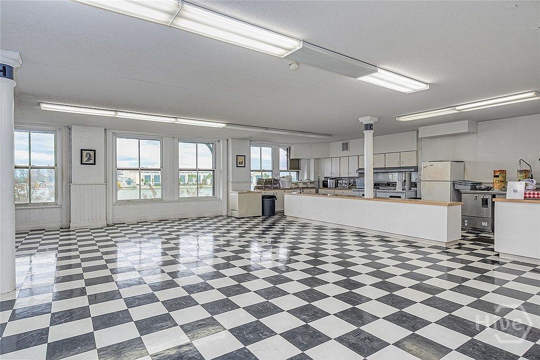 This expansive kitchen features a striking black and white checkered floor that adds a classic touch. Ample natural light pours in through large windows, illuminating the functional layout designed for family gatherings. The open-concept space seamlessly connects cooking and dining areas, promoting togetherness. Sleek white cabinetry and modern appliances maintain a clean aesthetic, while a wooden countertop provides warmth and practicality. Tall ceilings and supportive pillars emphasize spaciousness, making it ideal for culinary creativity. Easily accessible storage and spacious work zones enhance functionality, ensuring this kitchen is a hub for family meals and memorable moments.
