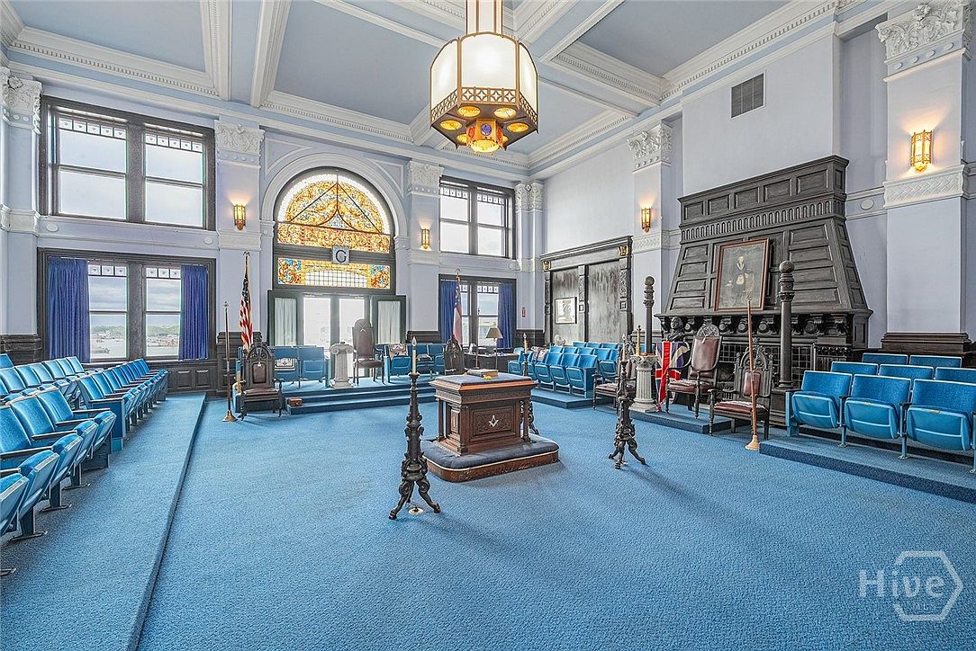 This distinguished lodge meeting room showcases an elegant layout characterized by rich architectural details. The striking high ceiling is adorned with intricate moldings, complemented by a beautiful chandelier that adds a warm glow. Deep blue carpeting enhances the room’s majesty, while the rows of classic blue seating invite members to gather. A stunning stained glass window serves as a focal point, flooding the space with colorful light. The dark, ornate fireplace with its regal mantle exudes sophistication, and the thoughtfully arranged podium and paraphernalia signify the room’s ceremonial purpose. Family-friendly features include ample seating for community gatherings.