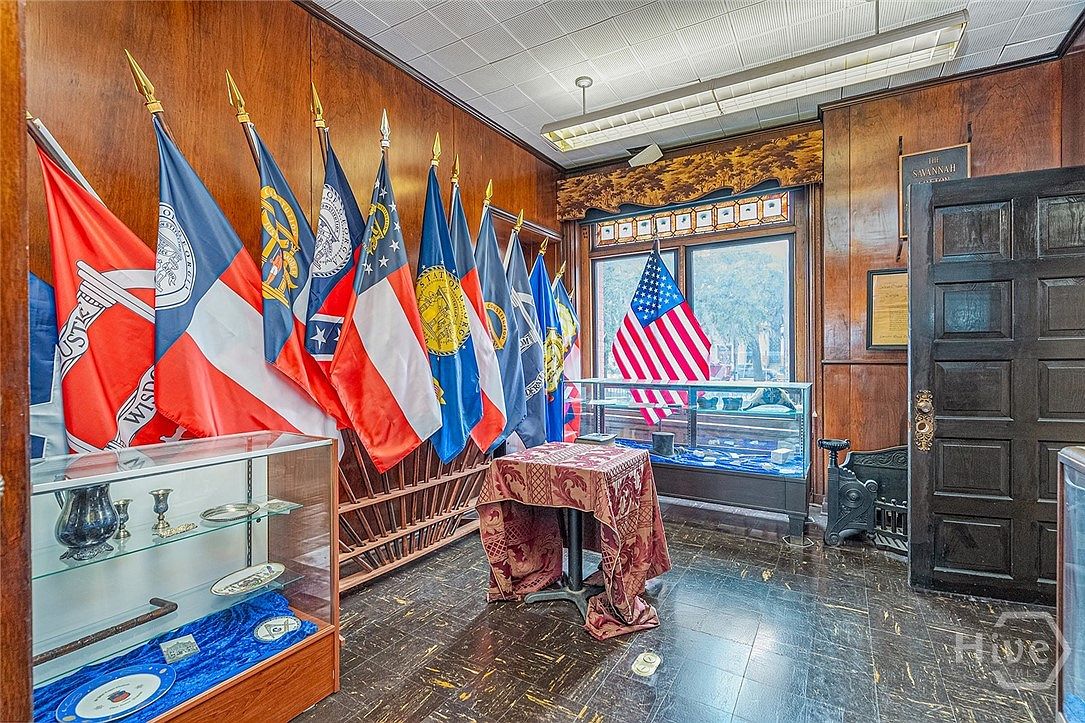A striking room dedicated to heritage, adorned with a vivid array of flags symbolizing various states and organizations. The rich wooden paneling creates a warm ambiance, complemented by the elegant design of framed windows that invite natural light. A central table covered with a patterned cloth adds a touch of sophistication, while a display cabinet showcases timeless artifacts. The dark flooring provides a modern contrast to the classic elements, making it a perfect family-friendly space for gatherings and events. The thoughtful arrangement encourages engagement with history, fostering pride and conversation within a stylish, inviting atmosphere.