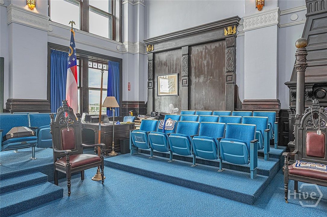 A striking courtroom featuring a blend of traditional and modern design elements. The rich blue carpeting and seating create a calm yet authoritative atmosphere, complemented by dark wooden accents that frame the space. Large windows, adorned with elegant drapes, flood the room with natural light, enhancing the ornate architectural details. A prominent judge’s chair stands out, designed for both comfort and status, while the contemporary seating arrangement caters to community needs, inviting civic involvement. Unique artwork on the walls adds a historical touch, making it a welcoming space for discussions and deliberations.