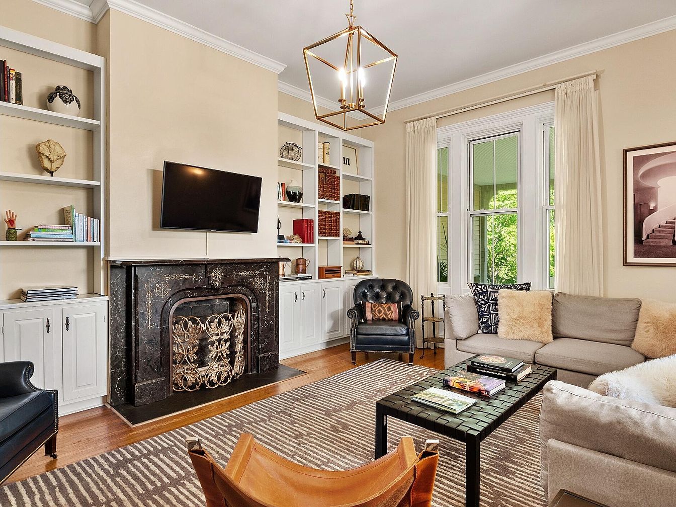 This inviting living room exudes warmth and style, featuring a harmonious blend of modern and classic elements. A striking black marble fireplace serves as a focal point, adorned with intricate detailing, while custom-built shelves hold cherished books and decor. Large windows draped with soft curtains allow natural light to flood the space, enhancing the light beige walls and creating a cozy ambiance. Comfortable seating, including a plush sectional and an elegant leather chair, encourages family gatherings. A geometric area rug adds a touch of texture, while the airy layout fosters connection and comfort in everyday living.
