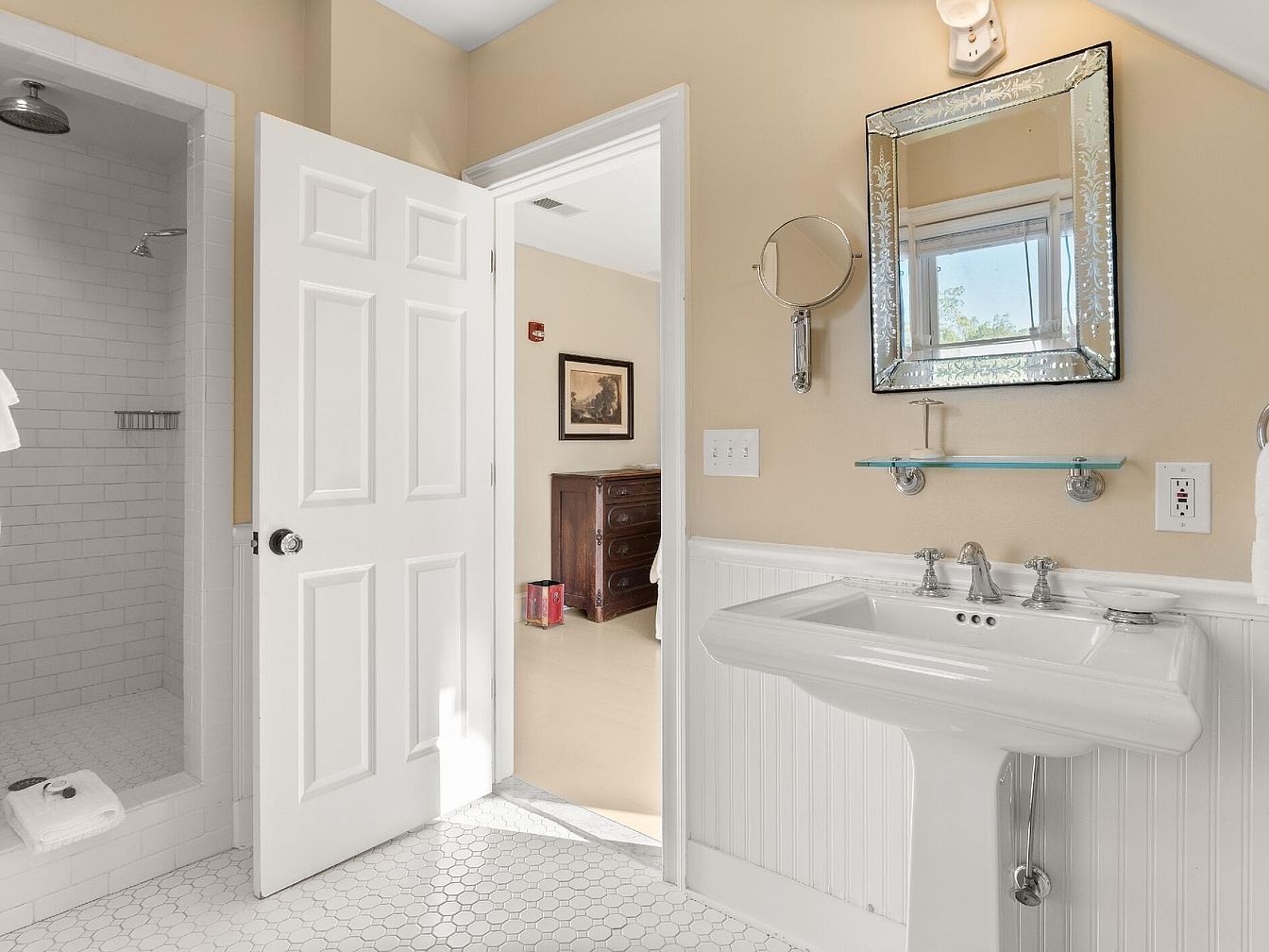 This bathroom beautifully combines modern aesthetics with practical features. The spacious layout includes a walk-in shower, highlighted by white subway tiles and a sleek glass shelf. A classic pedestal sink, in pristine white, complements the hexagonal floor tiles, adding a touch of elegance. Warm beige walls create a cozy ambiance, while strategically placed lighting enhances the overall brightness. Family-friendly elements are visible, with ample space for bath essentials. A large decorative mirror not only provides functionality but also reflects natural light from the window, making the room feel even larger and airier.