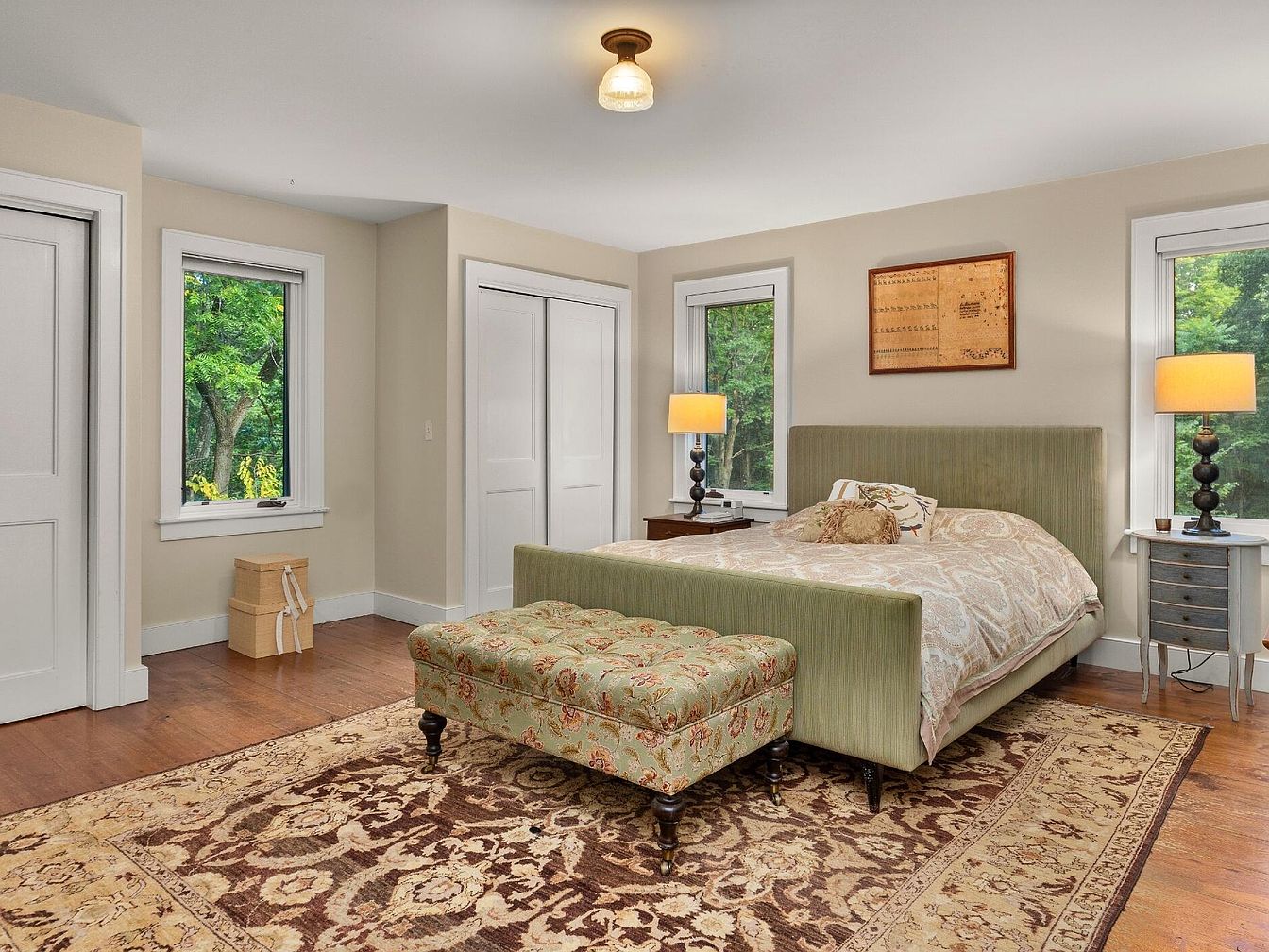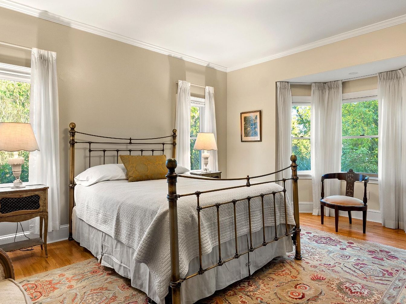 This master bedroom exudes tranquility with its inviting layout and soothing color scheme. A beautifully crafted bronze bedframe serves as the centerpiece, complemented by plush bedding and a decorative throw pillow for added comfort. The large windows draped with soft, sheer curtains allow natural light to flood the space, creating an airy atmosphere. Natural wood floors enhance the warmth, while a tasteful area rug adds a touch of elegance. This family-friendly space features a charming side table with a lamp, perfect for late-night reading. A stylish chair in the corner invites relaxation, making it an ideal retreat for restful nights.