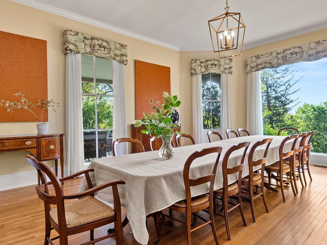 A spacious dining room exuding warmth and sophistication welcomes family gatherings. The long, inviting table, covered with a neutral linen tablecloth, offers ample seating for shared meals. Surrounding the table are elegantly crafted wooden chairs with woven seats, enhancing comfort and classic charm. Soft yellow walls contrast beautifully with striking orange artwork, while large windows frame views of lush greenery, flooding the space with natural light. Delicate drapery adds a touch of refinement, and a geometric pendant light fixture overhead creates an inviting ambiance. A nearby sideboard elegantly displays decor, emphasizing the room’s family-friendly and welcoming design.