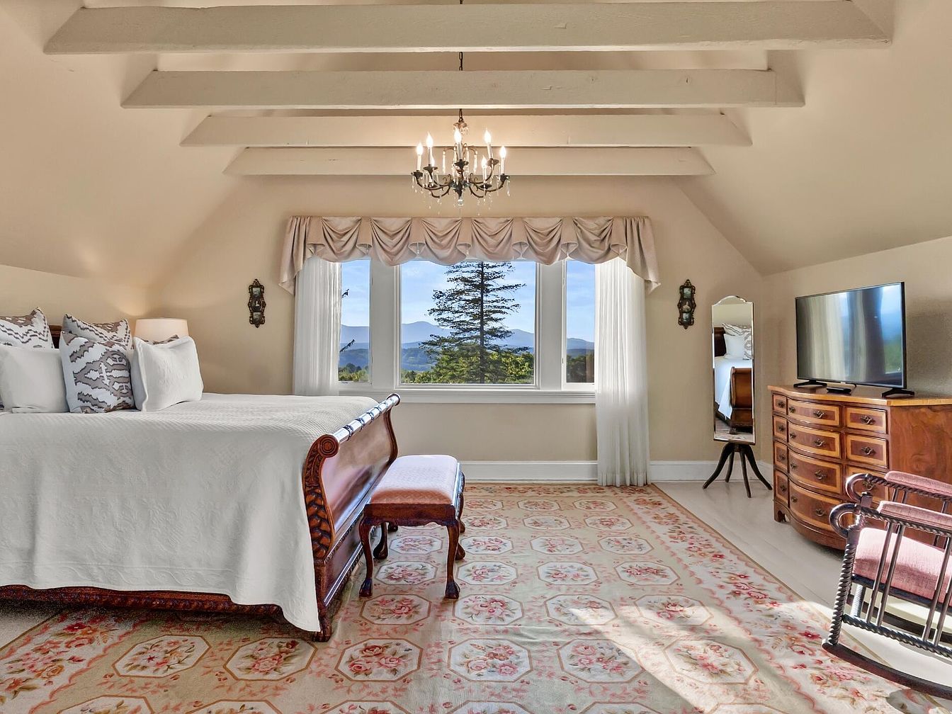 This master bedroom exudes elegance and tranquility, featuring a spacious layout adorned with vaulted ceilings and exposed wooden beams. A beautifully carved sleigh bed takes center stage, complemented by plush pillows and a cozy quilt. A delicate chandelier enhances the lighting, while large windows invite natural light and showcase panoramic views of the lush landscape outside. Soft, neutral tones dominate the color scheme, harmonizing with vintage furniture, including an ornate dresser and a charming sitting area. The plush area rug adds warmth and comfort, making this room a perfect family-friendly retreat for relaxation and rejuvenation.