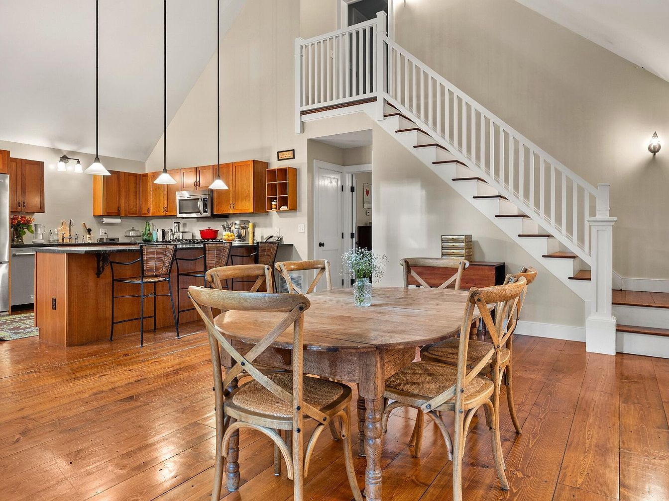 This open-concept space seamlessly blends the kitchen and dining area, showcasing warm wooden cabinets and a sleek countertop that invites culinary creativity. Pendant lights hang gracefully over the breakfast bar, illuminating the cozy seating below. The rustic wooden dining table, surrounded by classic cross-back chairs, creates an inviting atmosphere perfect for family gatherings. Rich, polished hardwood floors add warmth, while the high ceilings and spacious layout enhance the feeling of openness. A stylish staircase leads to the upper level, providing a touch of architectural elegance. This area embodies comfort and functionality, ideal for a family-friendly setting.