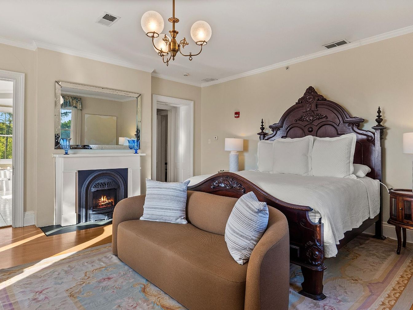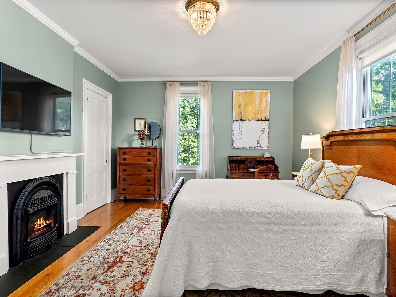 A serene master bedroom featuring soft green walls that create a calming atmosphere, complemented by white trim and crown molding. The focal point is a beautifully carved wooden bed, dressed in luxurious white linens and decorative pillows with golden accents. Natural light floods the space through large windows adorned with sheer curtains, enhancing the cozy feel. A vintage-style dresser sits against the wall, offering both functionality and charm, while a traditional fireplace adds warmth and character. A tasteful area rug brings together the color scheme, making this bedroom a perfect retreat for relaxation and comfort.