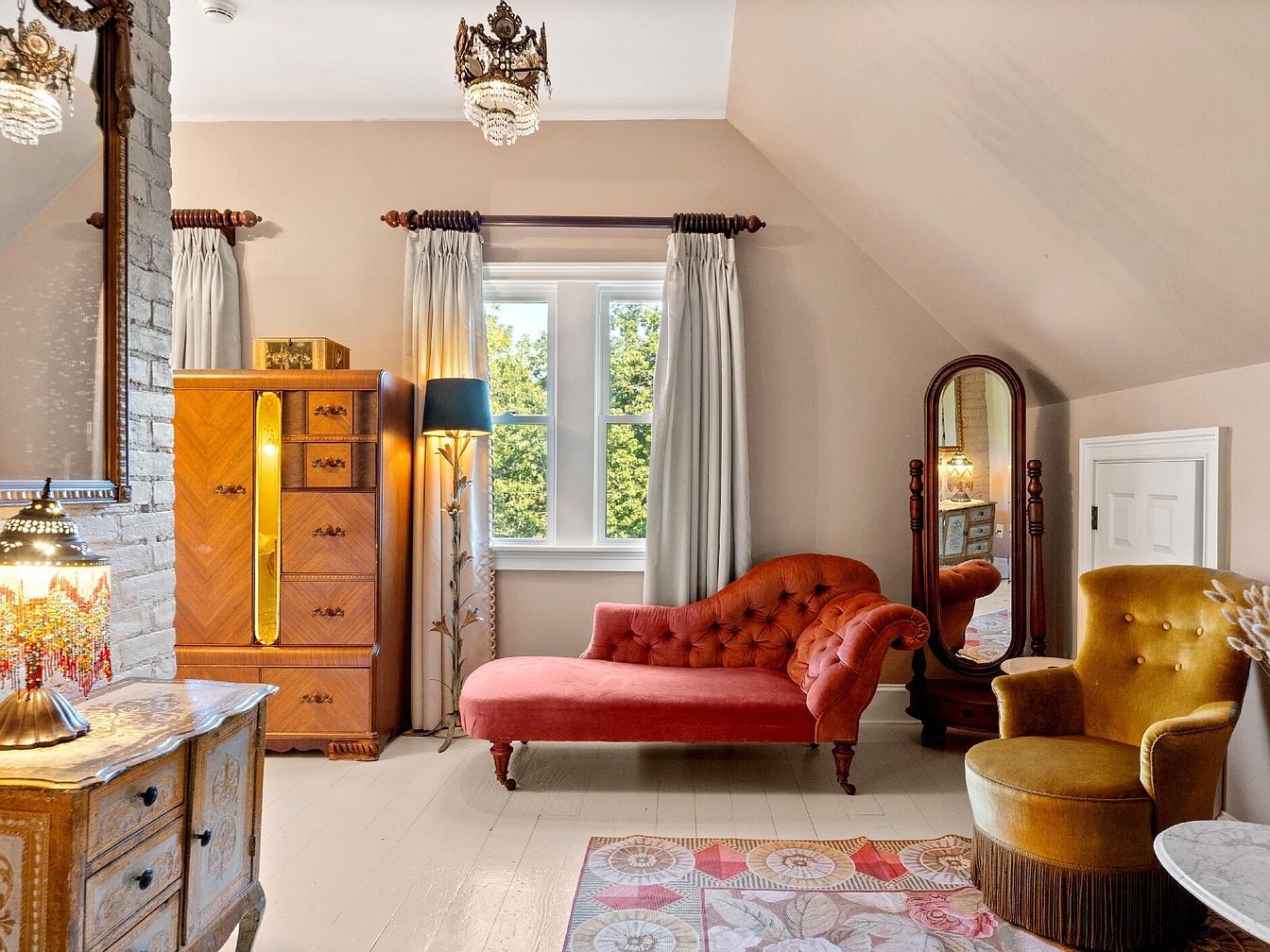This inviting reading nook blends vintage charm with modern comfort. The space features a delicate color scheme of soft peach walls and warm wooden accents, creating a serene atmosphere. A plush, tufted chaise lounge in a vibrant coral hue offers a cozy spot to unwind, while a gold velvet armchair adds a touch of elegance. The large window is adorned with flowing, light curtains that amplify natural light, enhancing the airy feel. Unique furnishings like a vintage oval mirror and ornate dresser contribute character, while softly glowing lamps provide a warm, welcoming ambiance perfect for family gatherings or quiet afternoons.