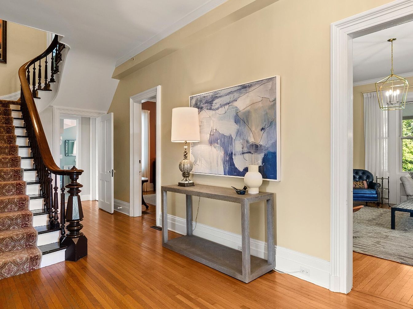 This welcoming entryway features warm hardwood flooring that invites guests into the home. The elegant staircase, adorned with a rich, patterned runner, showcases a traditional design with intricately carved banisters. Soft beige walls create a neutral backdrop, accented by a large abstract painting that adds a contemporary touch. A stylish console table, paired with a vintage lamp and decorative vase, provides a functional yet aesthetic element to the space. Natural light floods in from the adjacent living area, creating an inviting atmosphere perfect for family gatherings. This entryway beautifully balances classic charm with modern sophistication.