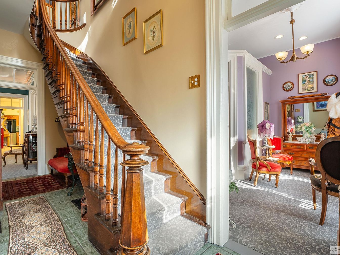 A classic wooden staircase with beautifully polished railings sets a welcoming tone as it winds elegantly upward, accented by a soft gray runner with subtle scrollwork. Warm neutral walls are offset by crisp white trim and doors, giving an airy, inviting feel. The hallway leads toward a cozy and radiant sitting room, where lavender walls create a soothing ambiance. Traditional furniture upholstered in rich red hues and ornate wooden details evoke a sense of timeless charm. Family-friendly features include ample open space for easy movement and durable surfaces that combine practical comfort with elegant style. Framed art and a patterned rug complete the sophisticated look.