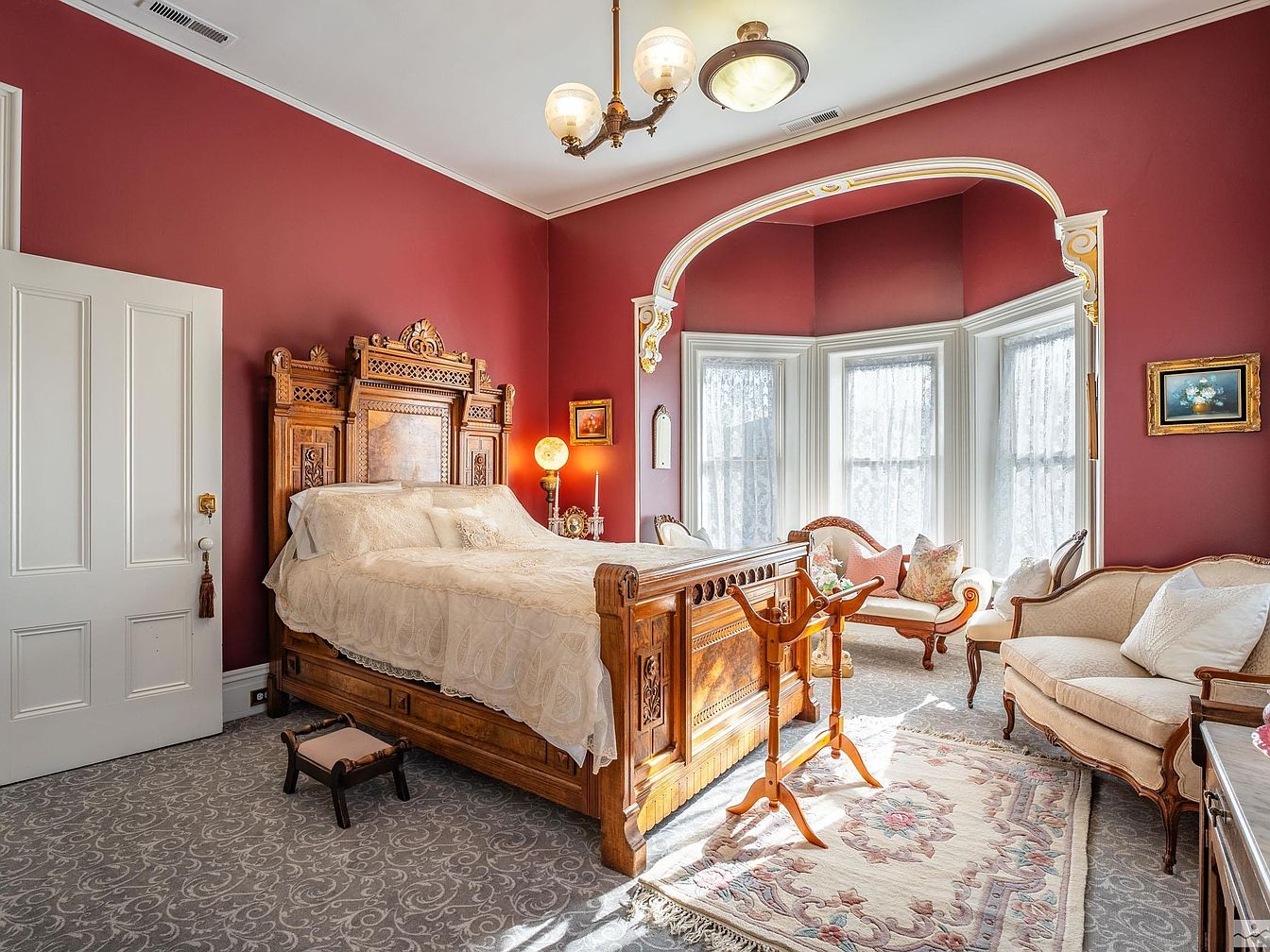 Rich burgundy walls set a cozy, inviting tone in this master bedroom suite, complemented by ornate crown molding and a grand, carved wood bed that becomes the centerpiece. An arched, open alcove brightens the space with natural light from bay windows adorned with delicate lace curtains, offering a perfect reading nook furnished with vintage loveseats and a chaise lounge. Elegant cream and pastel tones on the seating and floral area rug balance the deeper wall color and create a warm, sophisticated atmosphere. The layout encourages relaxation and quiet family time, with plush carpeting providing softness underfoot.