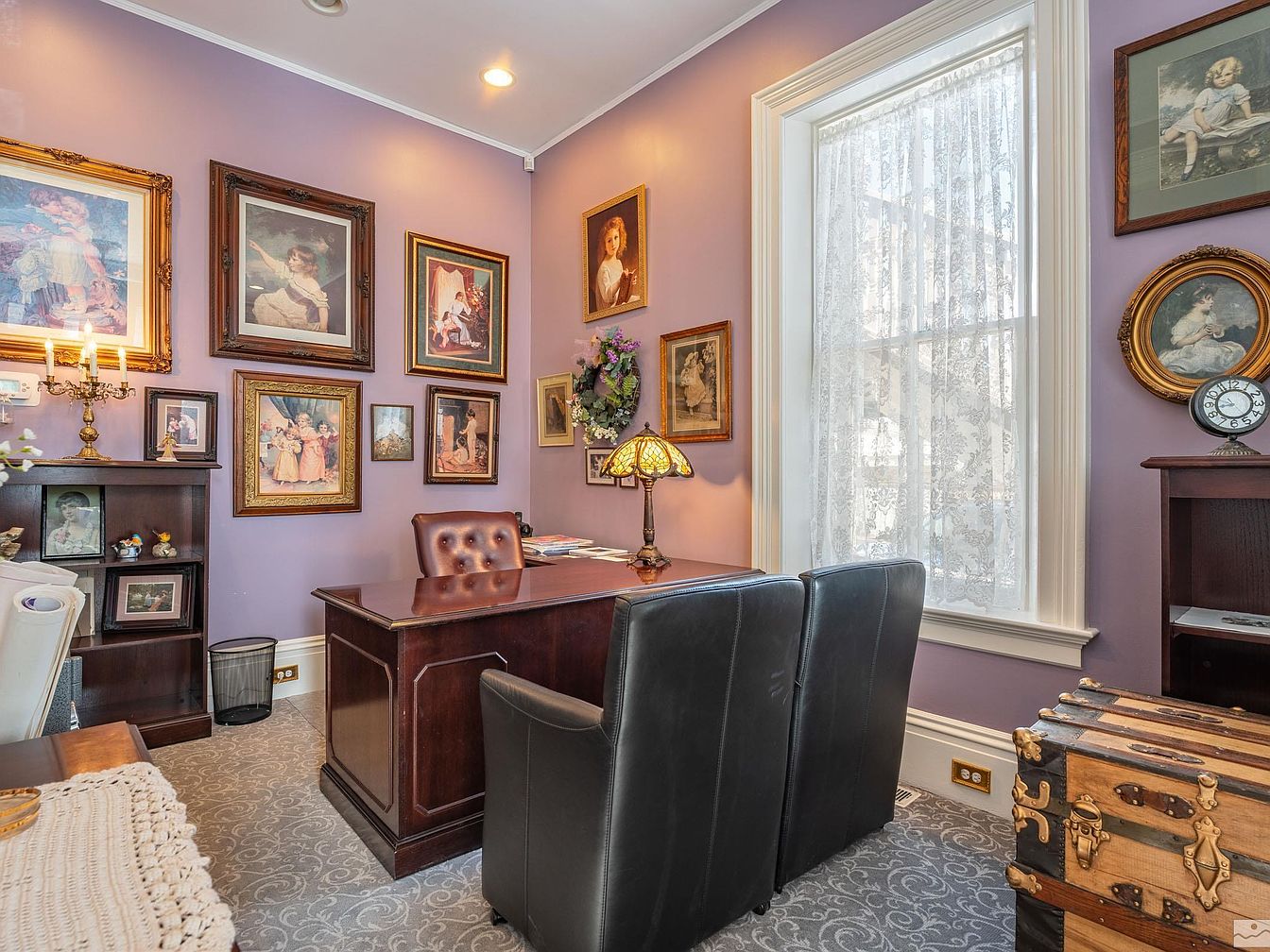 A sophisticated home office designed for productivity and comfort, this room boasts lavender-hued walls adorned with classic framed portraits and artwork, adding warmth and a touch of nostalgia. The substantial wooden desk, paired with two plush black leather chairs, creates a welcoming workspace for both personal and family tasks. Natural light pours in through a large window dressed in delicate lace curtains, enhancing the spacious feel and providing a serene atmosphere. Ornate details, such as a Tiffany-style desk lamp and a vintage trunk, complement the cozy carpet with its intricate pattern, making this office both functional and inspiring for all ages.