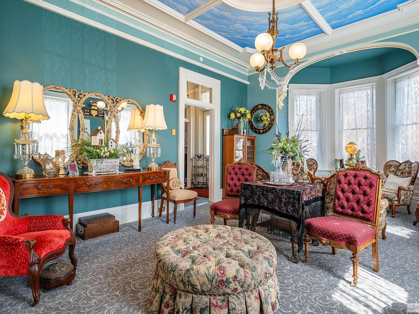 This elegantly decorated living room radiates classic Victorian charm, with a rich teal wall color contrasting beautifully against intricate white crown molding and a ceiling painted with serene blue skies and clouds. The room offers a warm, inviting layout, perfect for family gatherings or afternoon tea. Ornate gold-framed mirrors and traditional lamps sit atop a carved wooden console, while plush, tufted chairs in deep red tones and a large floral ottoman anchor the space. Sunlight pours through tall bay windows dressed in lace, casting a gentle glow on the antique furnishings and soft patterned carpet, creating both comfort and sophistication.