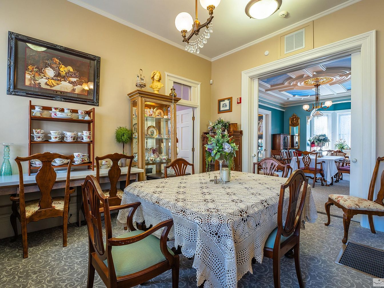 A grand dining room filled with classic charm, featuring an ornate coffered ceiling with hand-painted sky detail and gilded medallion, setting a regal tone. Rich teal walls contrast beautifully with crisp white moldings, and the bay windows flood the room with natural light, creating a welcoming space for family gatherings. The centerpiece is a spacious dining table surrounded by carved wooden chairs with plush upholstery, perfect for shared meals. Vintage furniture, floral arrangements, and delicate lace curtains add warmth and sophistication, while the adjoining parlor and roomy layout offer flexibility for hosting and comfortable movement for all ages.
